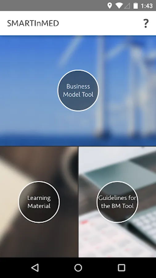 The APP is composed of 3 main sections: “Learning material”, “Guidelines of the BM tool” and “Business model Tool”.