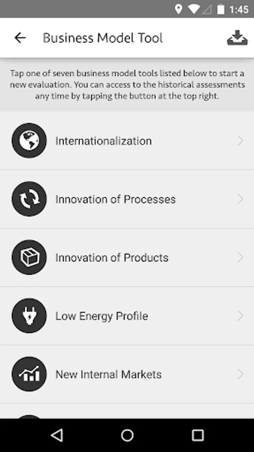 “Business Model Tool” is the core of the APP. It is an easy tool to assess and improve companies/clusters business strategies in the fields of renewable energies and energy efficiency along 7 macro-themes/strategies assessed as relevant in companies business strategies: internationalization,new customers / markets,integrated / turn-key solutions,improved products quality,product innovation,processes innovation, green businesses.