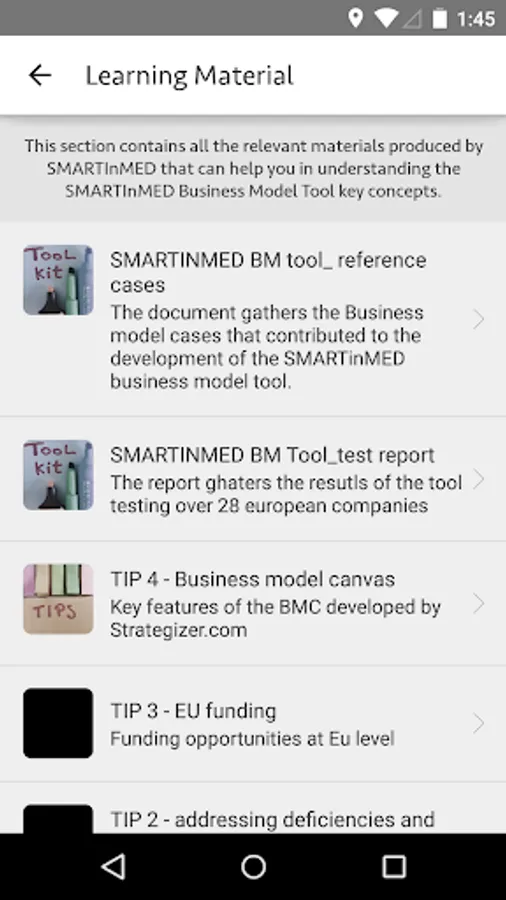 “Learning material” contains all the relevant materials produced by SMARTinMED that can help companies and clusters in understanding the Business model Tool key concepts.