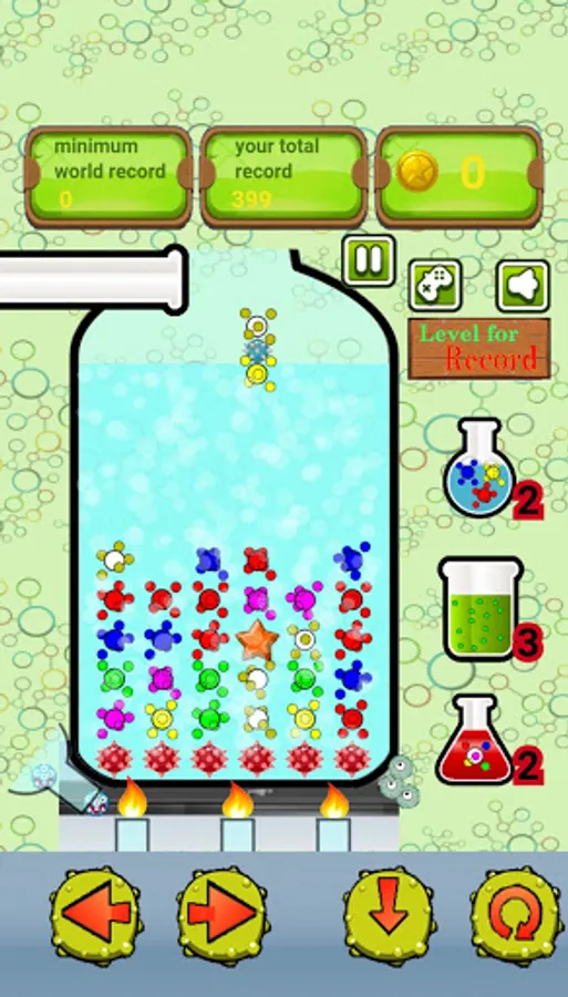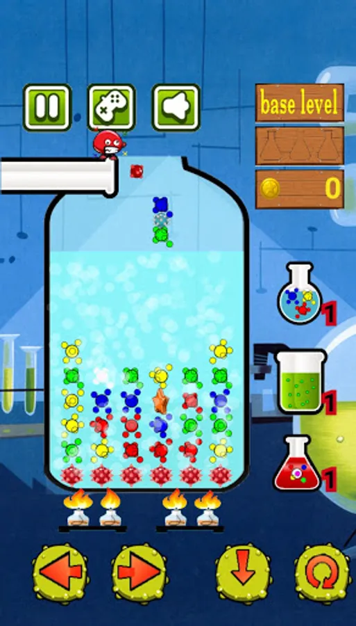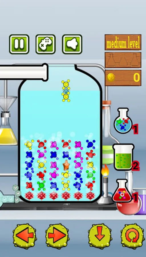 To help you have 3 types of bonuses: one allows you to eliminate the entire row of atoms (except the last row, which will be protected from viruses that run in the laboratory); one will allow you to add liquid to the ampoule (so in fact it allows you to increase the time available to you); the third makes the descending atom compatible with any type of atom present in the ampoule (practically it is a wild card).