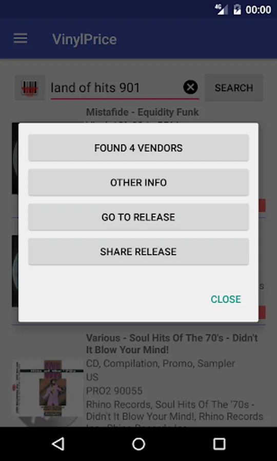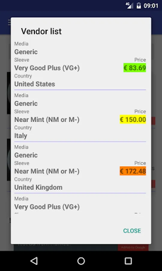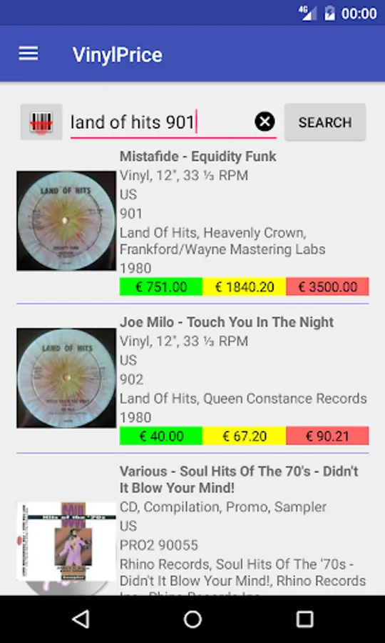 In fact, this application allows you to find, through the well-stocked music catalog "discogs.com", the prices of the respective vinyl, calculating in real time minimum, average and maximum price of those who at this moment are selling just the vinyl you're looking for.