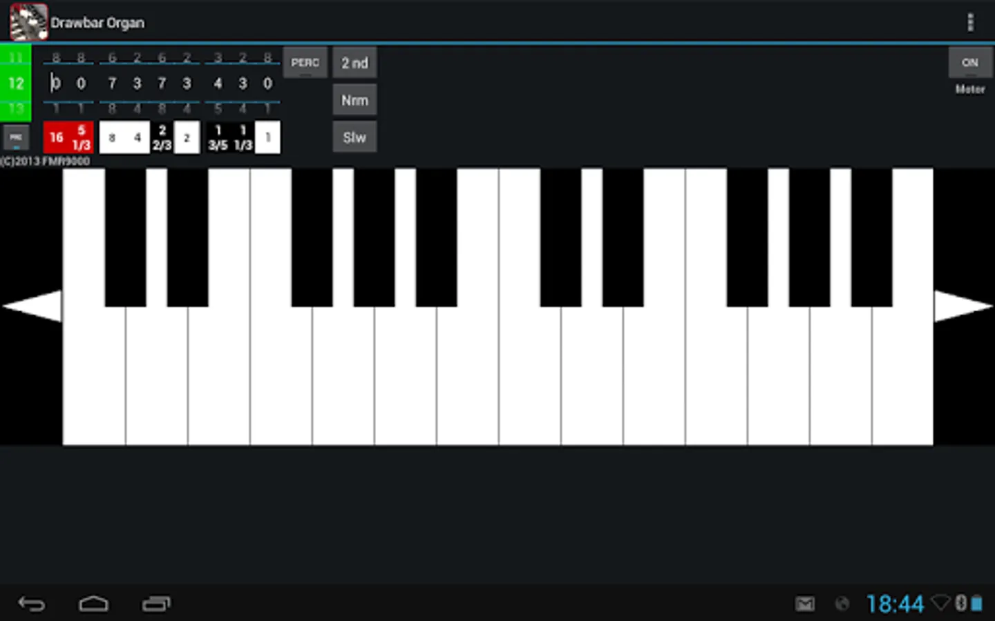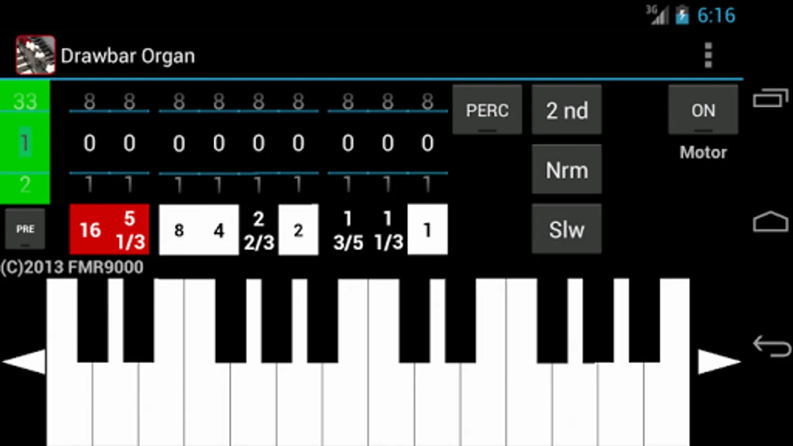 9 drawbars 16, 5 1/3, 8, 4, 2 2/3, 2, 1 3/5, 1 1/3, 1