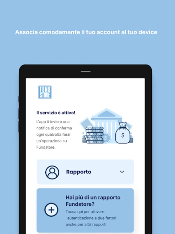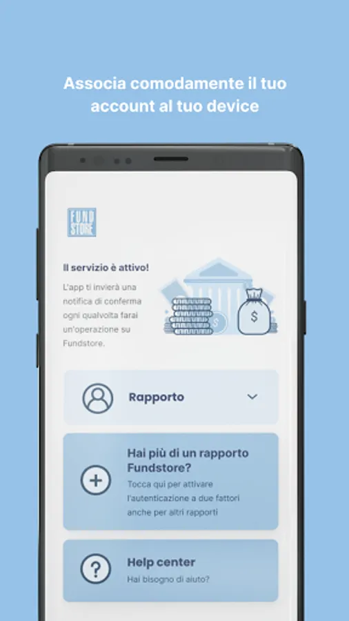 Thanks to the two-factor authentication and a renewed graphic interface, the app allows you to authorize the operations carried out on the Fundstore site in an even more secure and intuitive way.