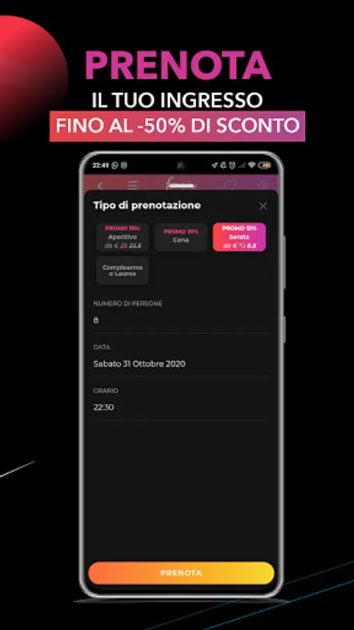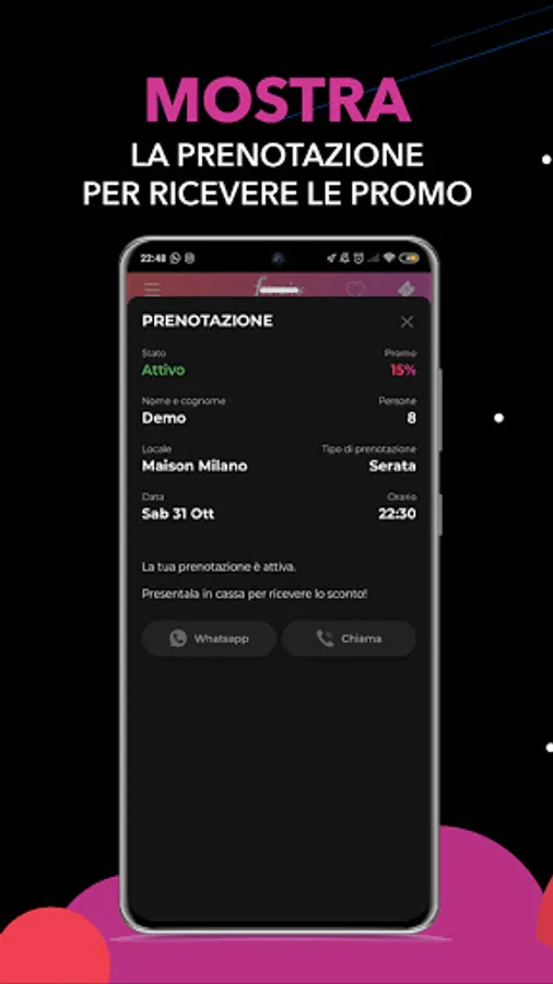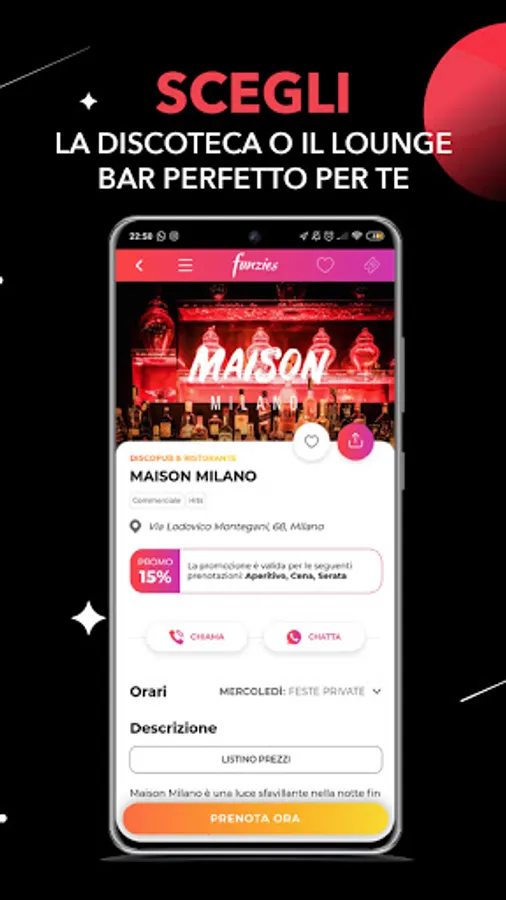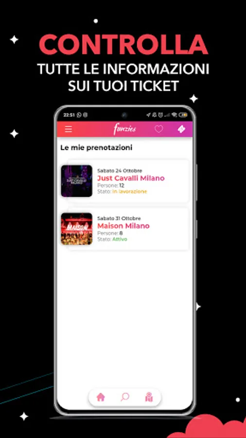 Once you've found the evening you're looking for, click on it and book your entries on the list. In the reservations section you will be able to view all your tickets. By opening them you will have a summary of all the information about the event, such as the name of the evening, date and time, location, address, dress code, price and name of the list to be communicated at the entrance of the venue to start your evening.