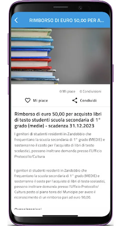 The App acts as a single access point to interact in a simple way with the services of the Municipality of Zandobbio and allows to reduce management times and favor instant communication.