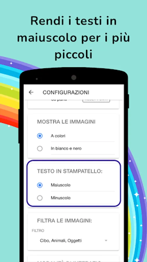 Testi in maiuscolo: per venire incontro ai più piccoli che si approcciano al linguaggio.