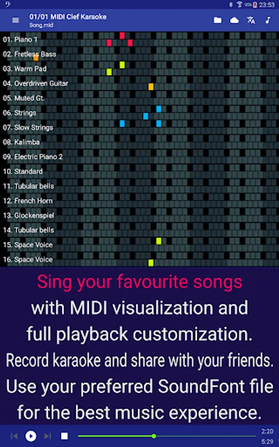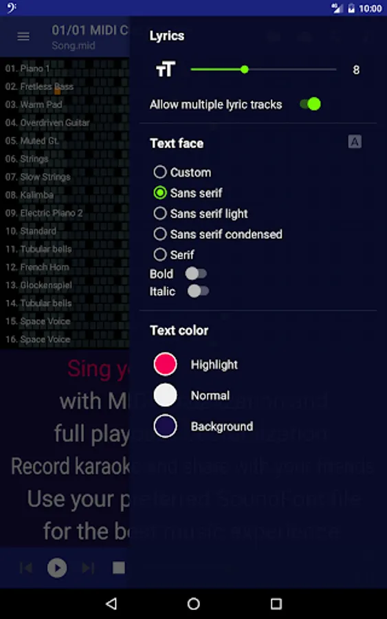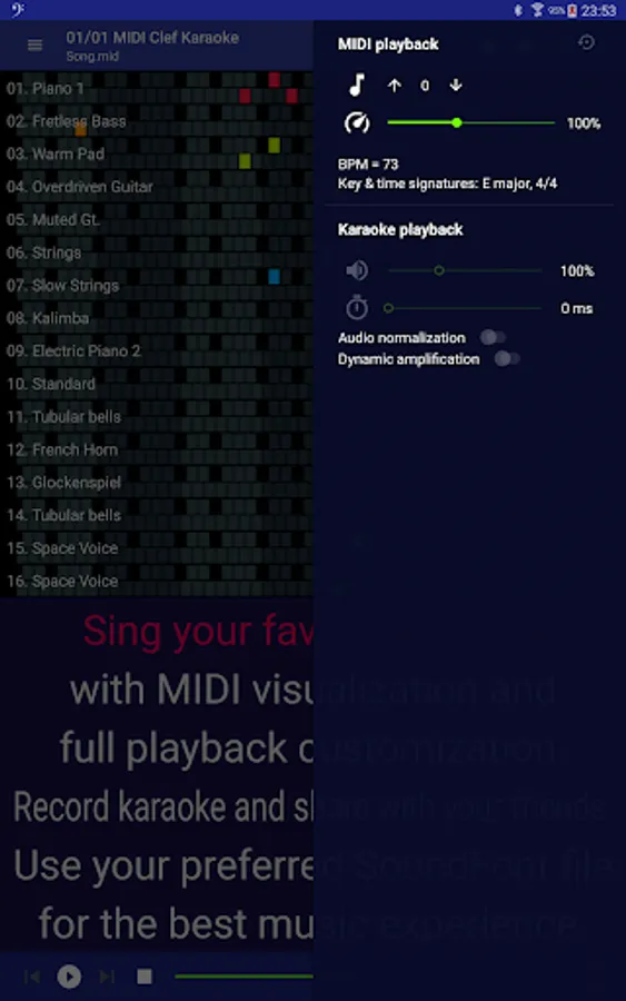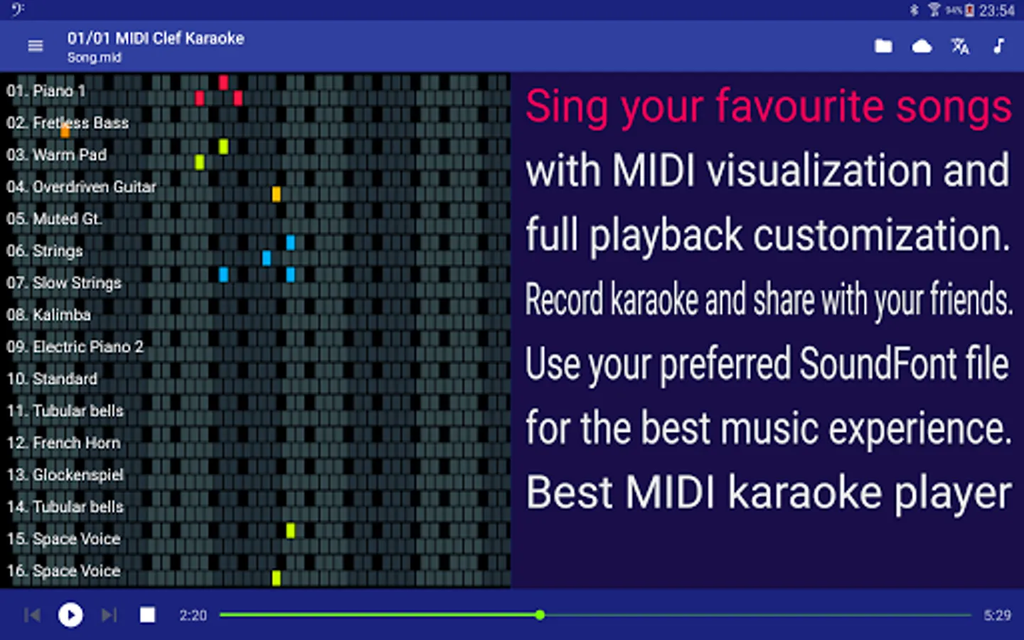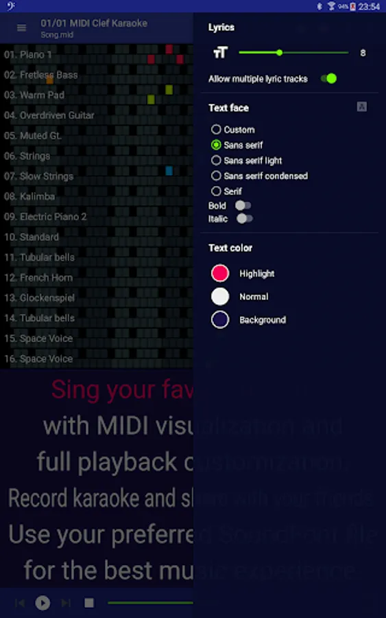 ✓ Full support of MID and KAR files with embedded Karaoke lyrics.