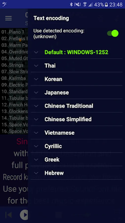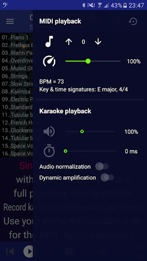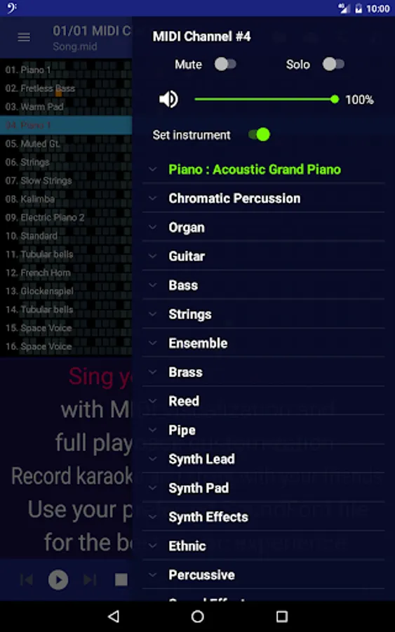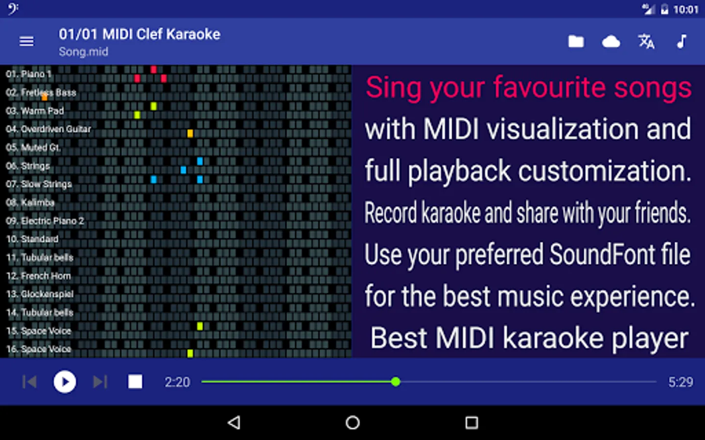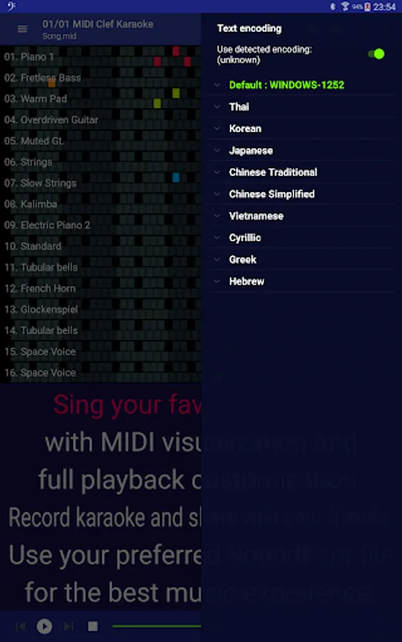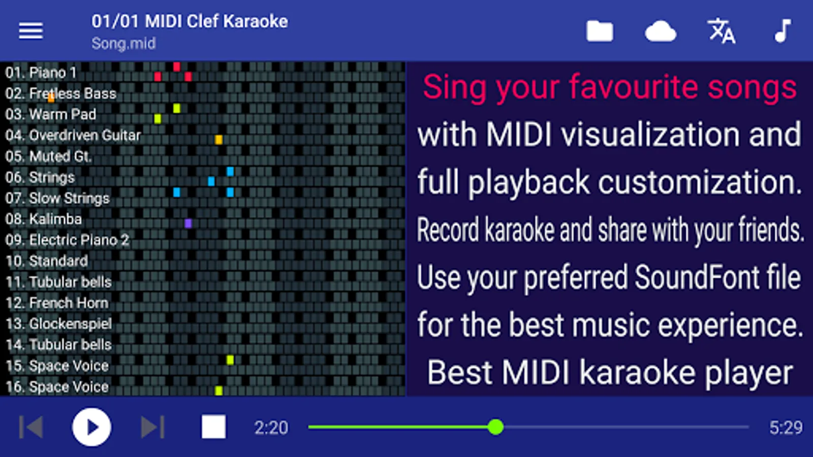 ✓ Full support of MID and KAR files with embedded Karaoke lyrics.