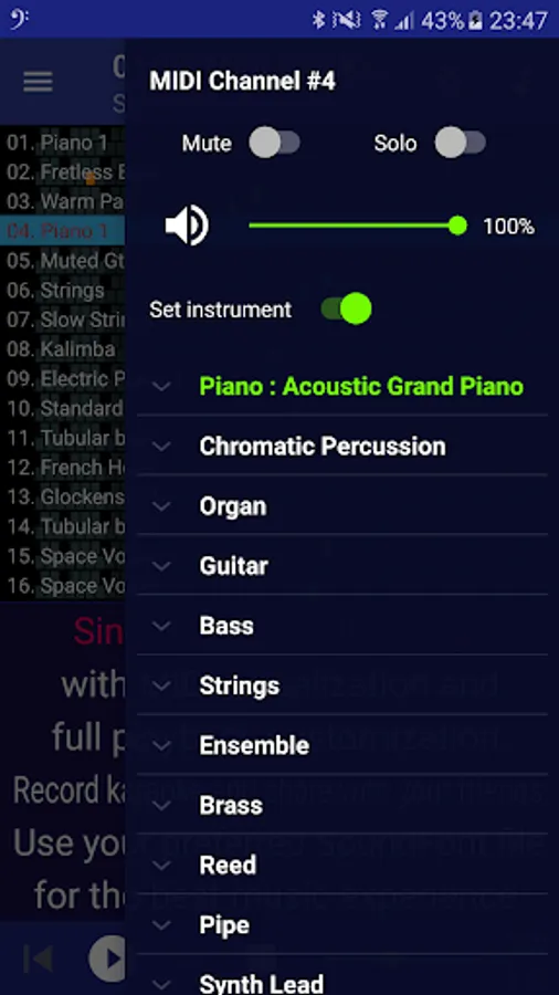 ✓ Select your SF2 SoundFont files and instruments for the MIDI playback.