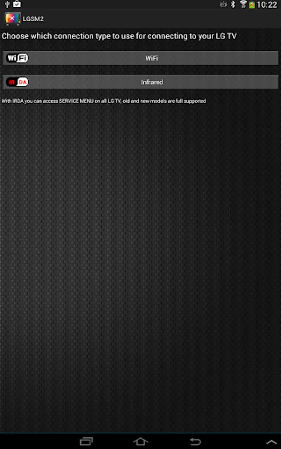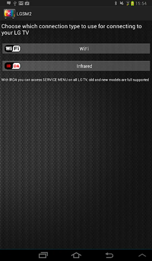 This application (the 1st and only that work through network connection and infrared) is very simple, use it to enable the two secret service menu of LG TVs, so you can have extra functionality like DIVX and DVR and much more! In addition to that, the app is also a remote controller and allows you to use the DVR functionality. You can control all TV models from the old to the newer. Only 2011 models supports network connection, for all other models you must use infrared. Supported infrared are phones with builtin infrared transmitter o infrared dongle like IRDroid V1.0 (open source project at www.irdorid.com) connected to headphone connector. The application is tested with 42LW650G and some 2013 / 2014 models.