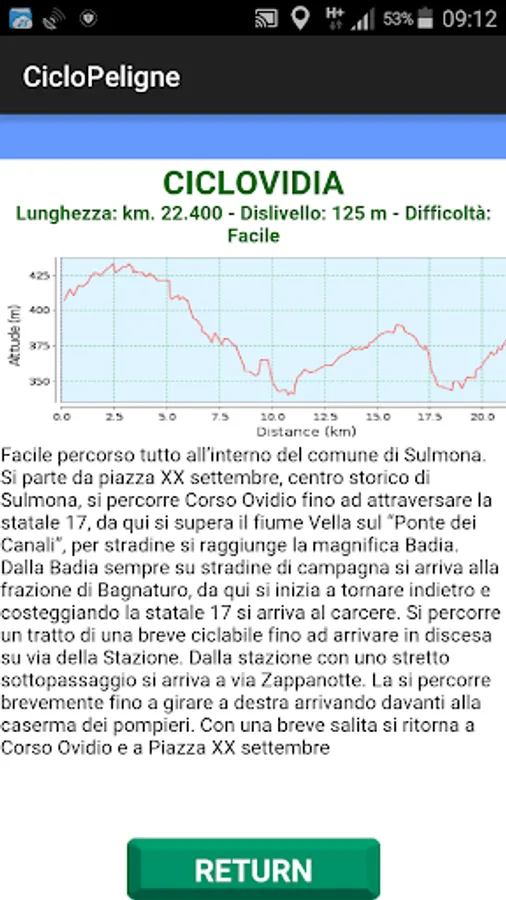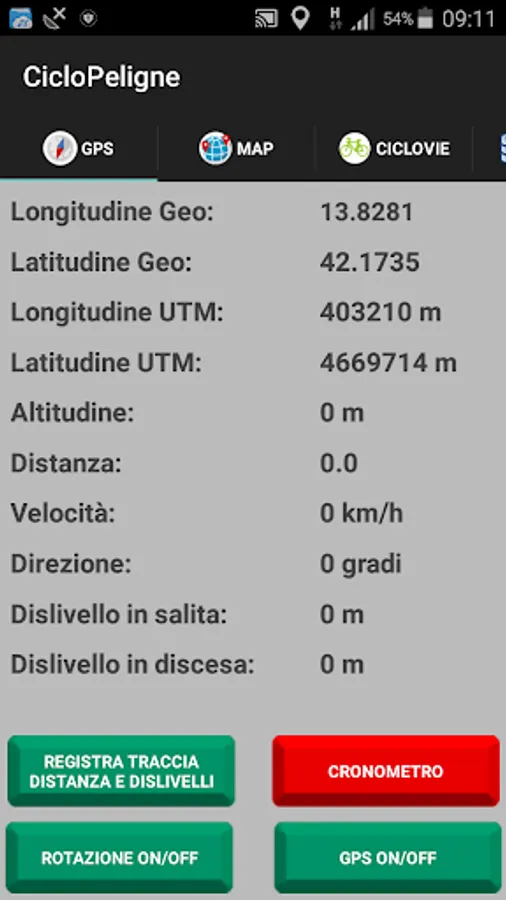 App that allows you to follow six cycleways of the Peligna Valley: Ciclovidia, Sagittarius, Bicincontriamoci, Terre dei Peligni and Gizio. The cyclist can follow on the screen of the smartphone of a different color traces that indicate the route on a map of the Valley Peligna offline (does not require a network connection). They are also provided all of the GPS location data: Geo and UTM coordinates, altitude, distance traveled, speed, direction and uphill and downhill gradients. triangular icon indicates your location, you can zoom into the paper and even move it, either with the usual gestures of Android is with two small buttons. The maps automatically rotates in the direction of travel, or you can lock the rotation and the GPS pointer rotates in the direction of travel. The altimetry of the paths with a brief description is also provided.