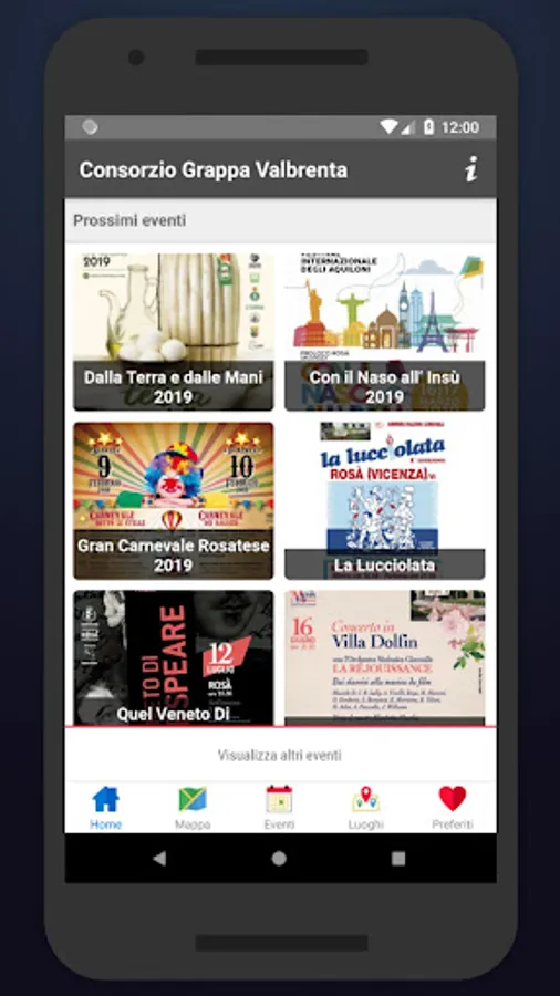 The app of the Grappa Valbrenta Consortium allows you to be always up to date with the events organized by the 14 Proloco in the Bassano area. When the event is created, you will receive a notification to let you know, and you also have the possibility to add it to your favorites and receive a reminder the day before the event.