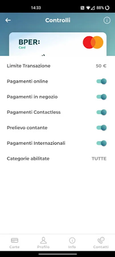 ‧ With the "Control", "Alert" functions, enter spending limits, blocks by geographical area, amount, product category and channel