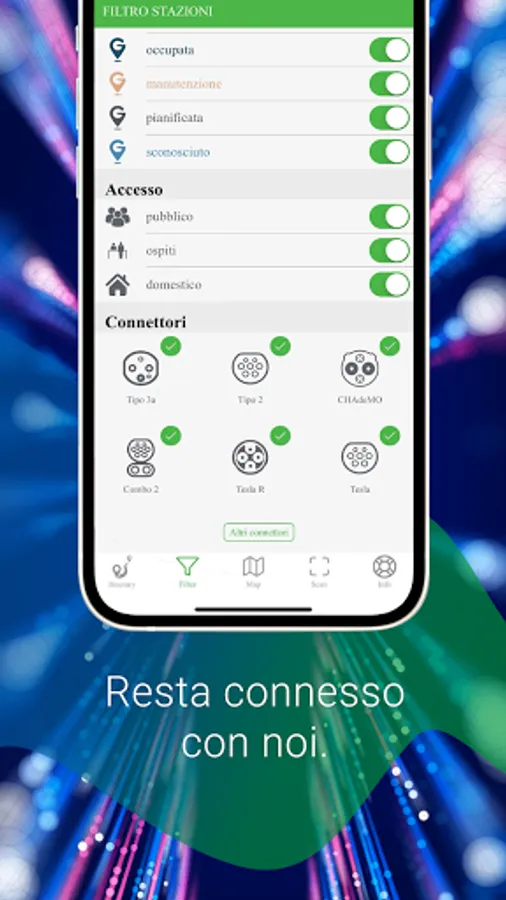 Within the App you can find details of all charging points with details of cost, power, real-time availability status and type of connectors.