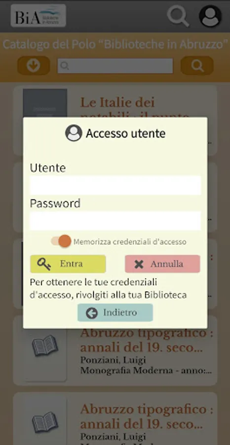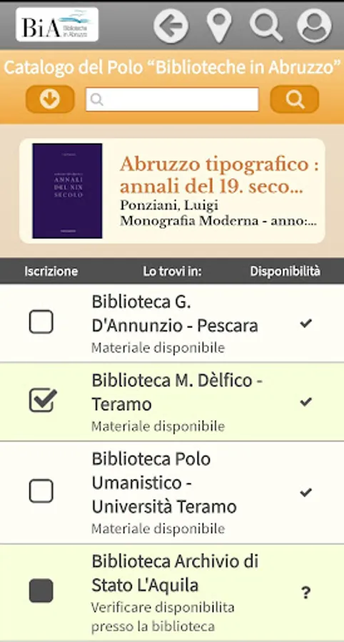 BiA is the app that allows you to consult the Catalog of the "Libraries in Abruzzo" Cluster to which the four libraries of the provincial capitals belong (Dèlfico, De Meis, D'Annunzio and Tommasi), university libraries, municipal libraries and Promotion Agencies cultural region of the Abruzzo region, with a total documentary heritage of over 600,000 volumes.
