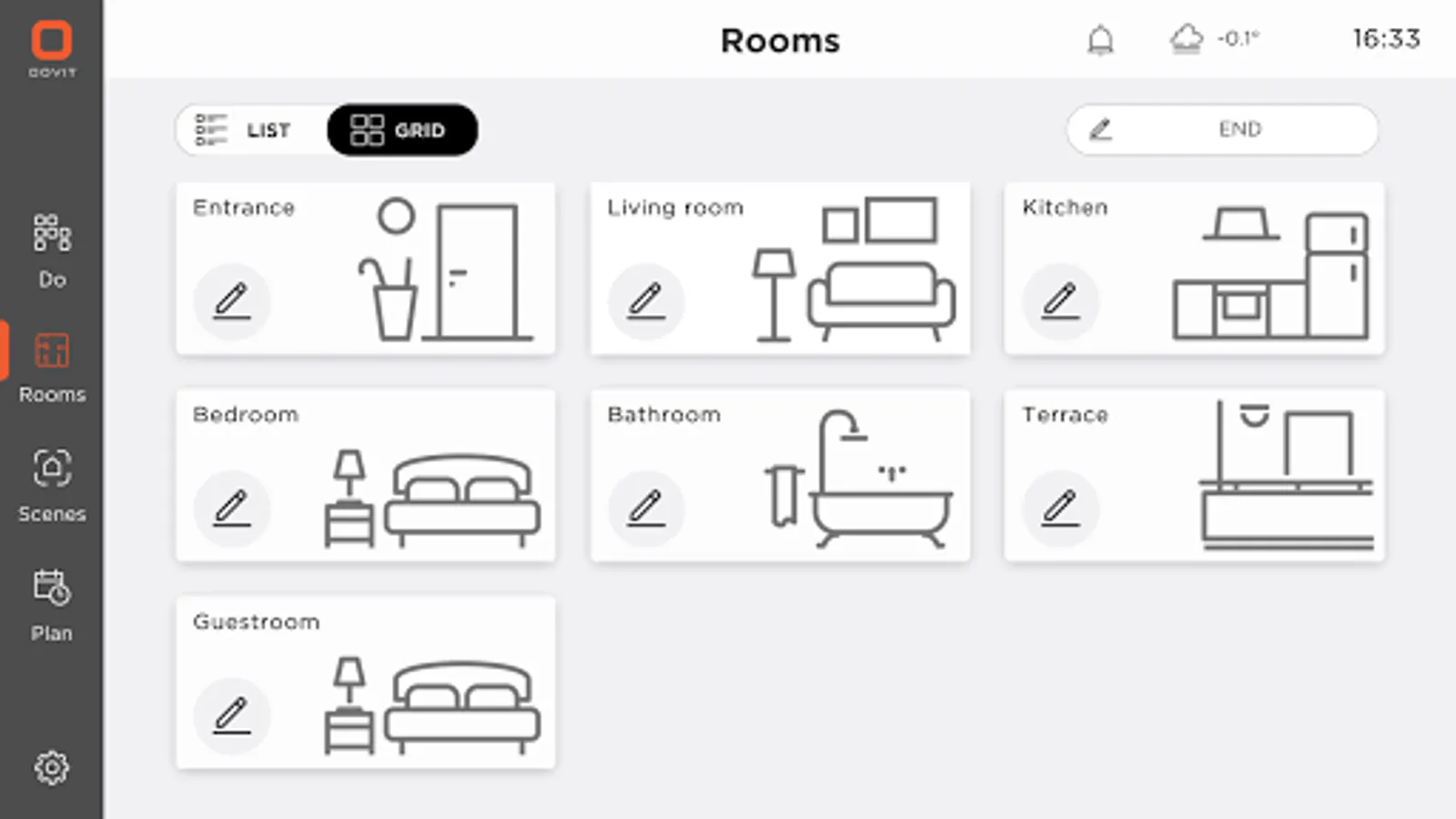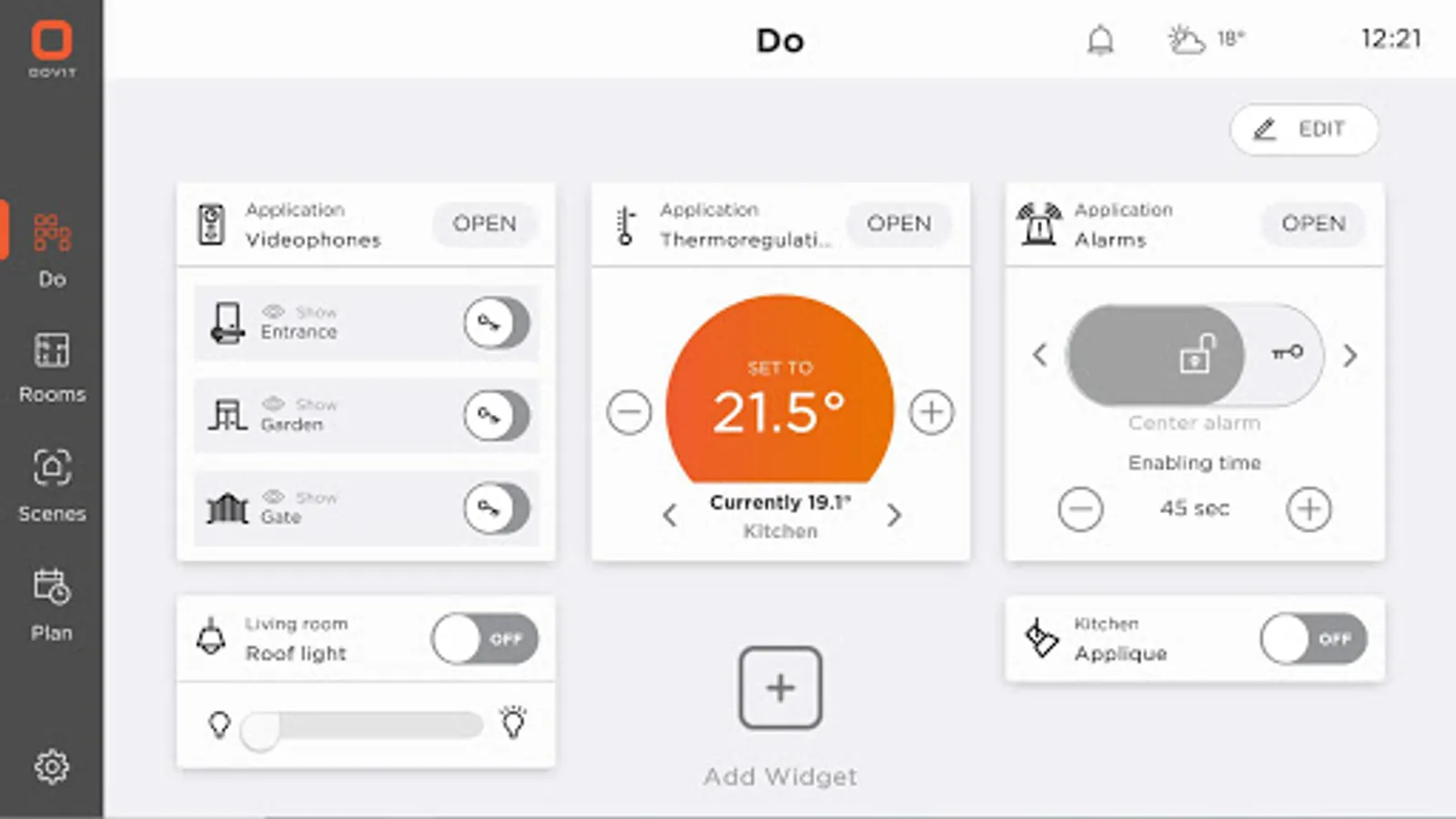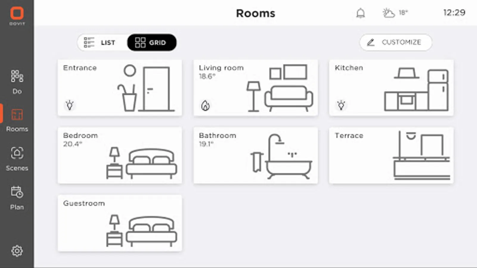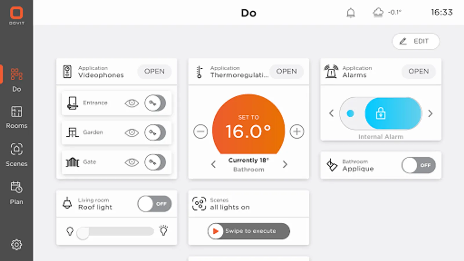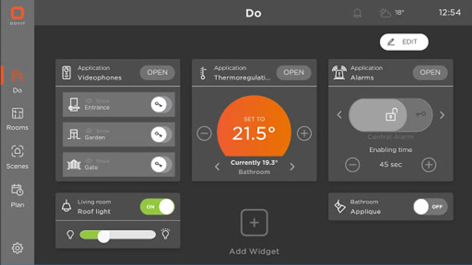 Dovit centralizes, in a single screen, all the traditional smart home options such as heating, lighting, blind control, alarm and videophone systems.