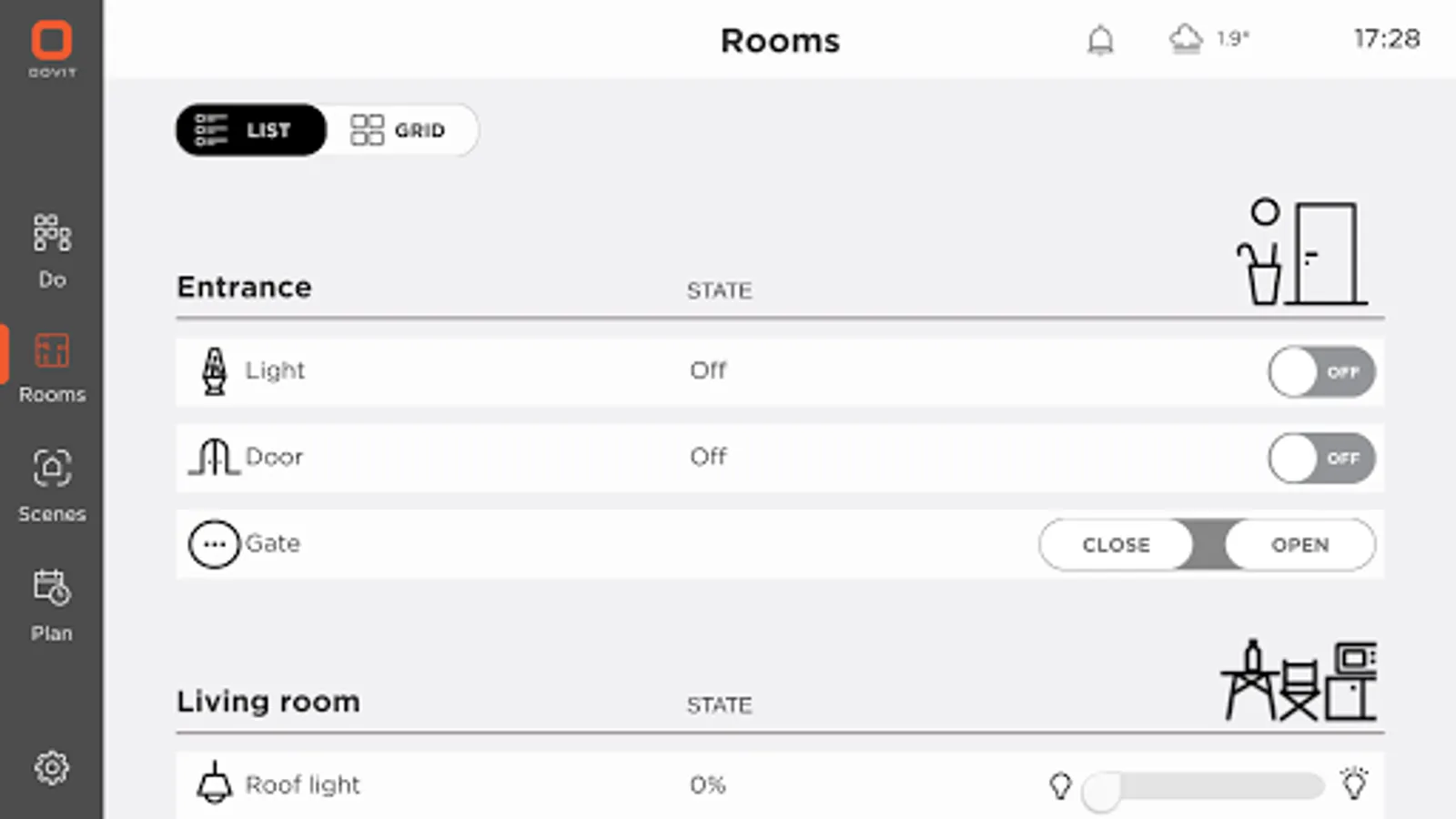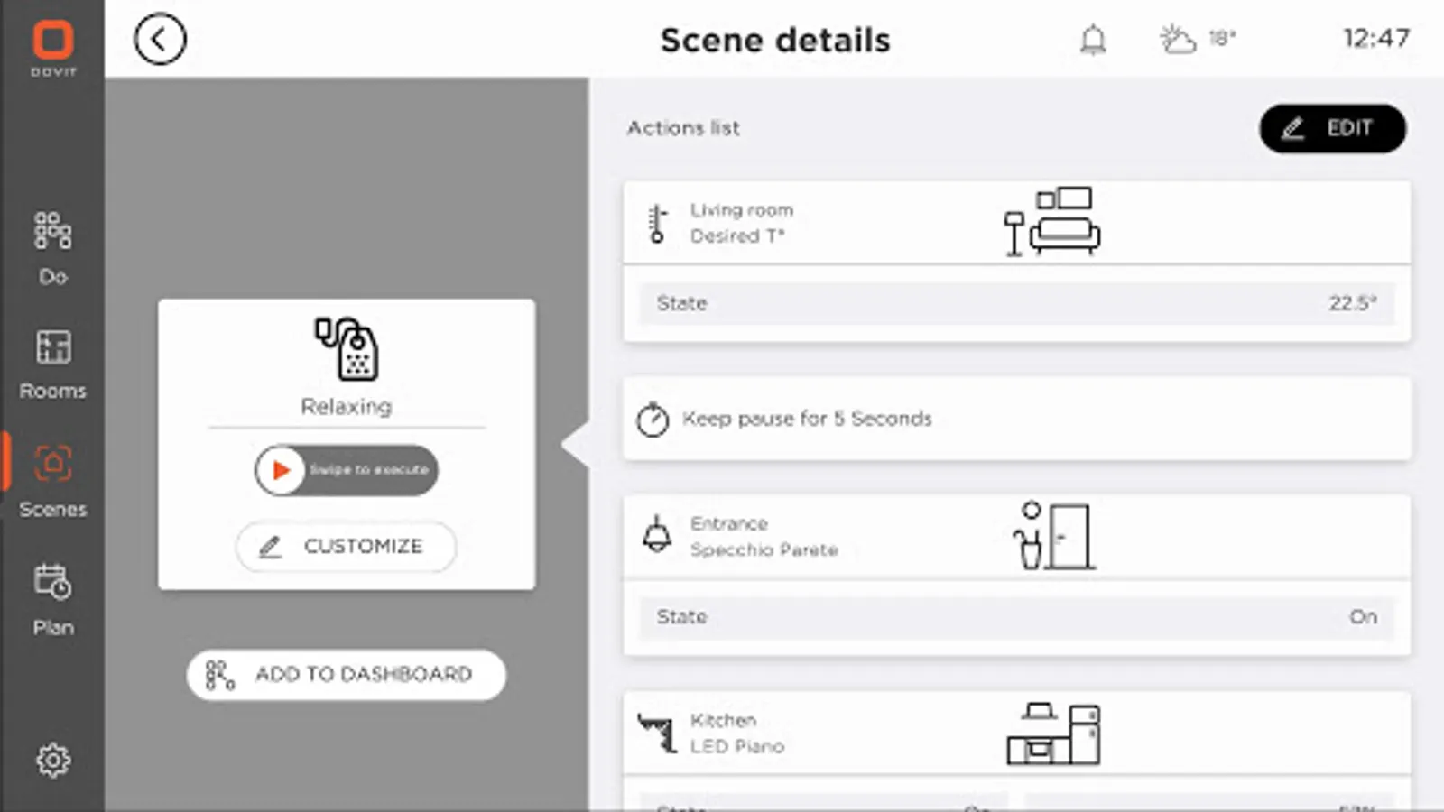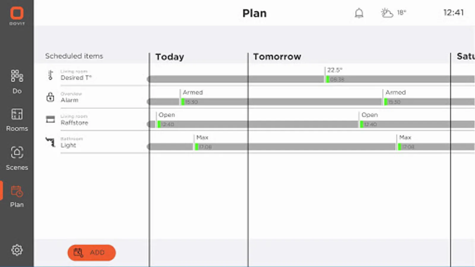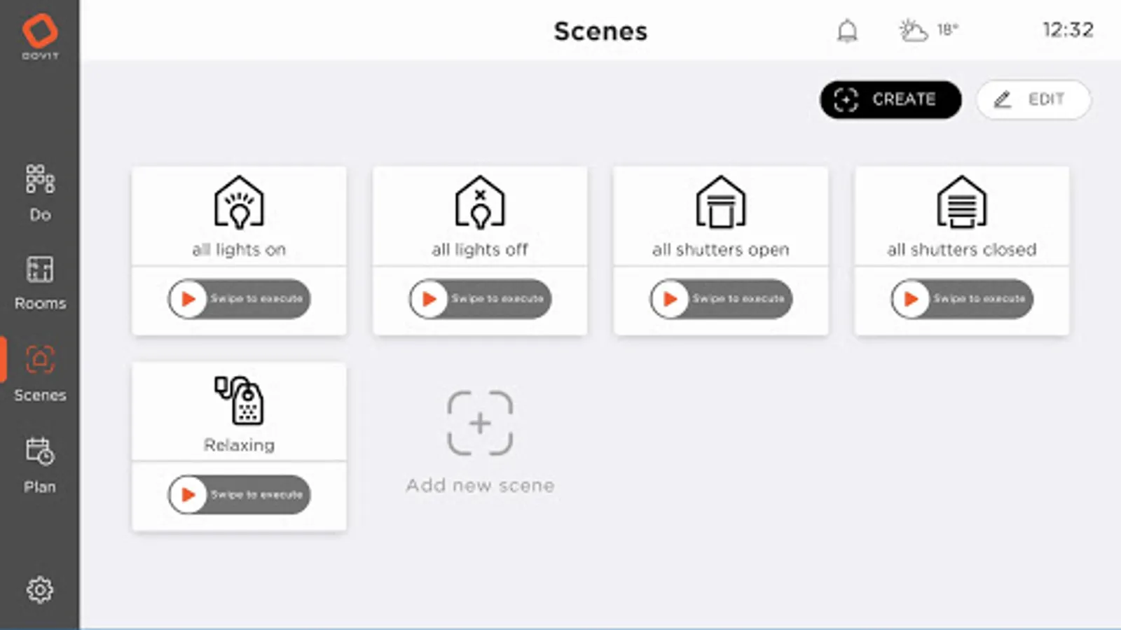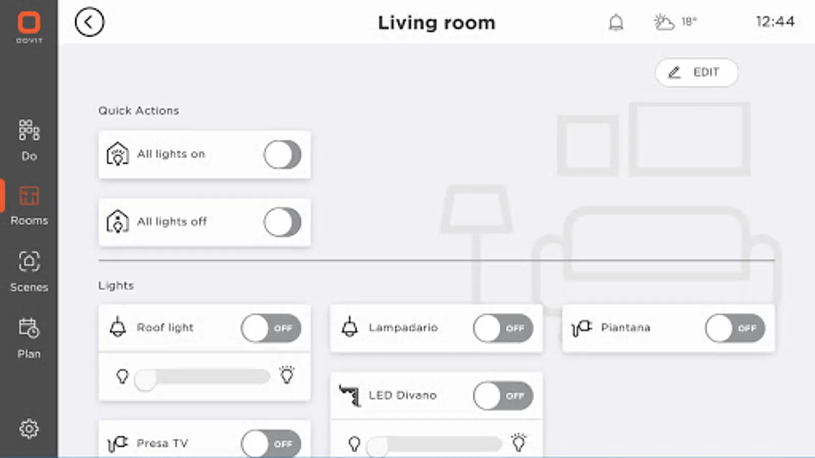 Dovit centralizes, in a single screen, all the traditional smart home options such as heating, lighting, blind control, alarm and videophone systems.