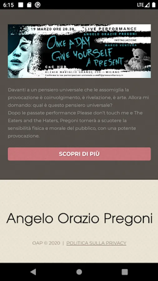 Download the application to see the most significant images of past performances, the videos, the anecdotes and the beauty of the olfactory anthropomorphism sheets, as well as the serigraphs produced on a scale: unique pieces hand-finished by Angelo Orazio Pregoni.