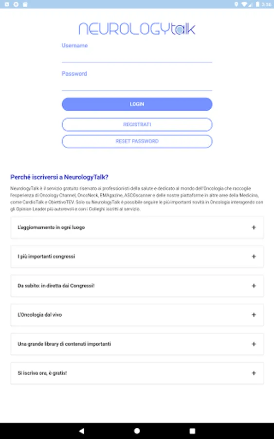 NeuroTalk is the free service reserved for health professionals and dedicated to the world of Neurology that collects the experience of CnC GROUP in training and information in Medicine and platforms in other areas of Medicine, such as CardioTalk, ObiettivoTEV, OncoTalk. Only with NeuroTalk it is possible to follow the most important news in Neurology by interacting with the most authoritative Opinion Leaders and with Colleagues enrolled in the service.