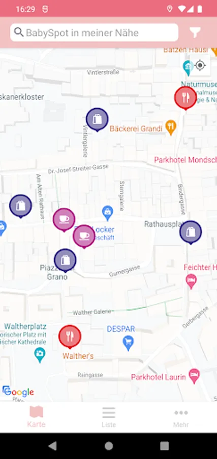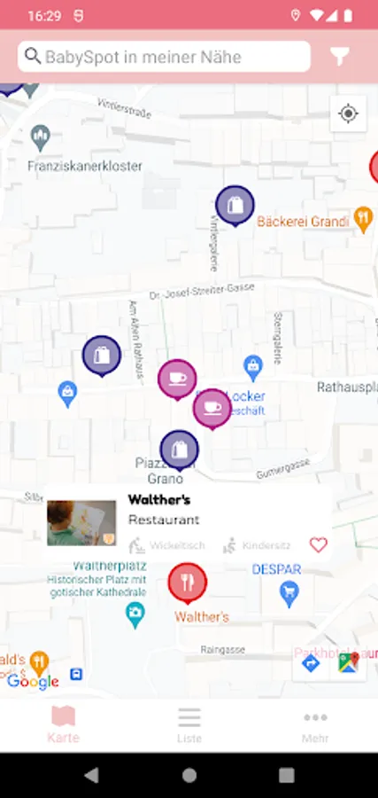 With the search function, the different BabySpots can be displayed in different categories. If you are looking for a destination on the road or you are planning an excursion, the desired location can be searched on the interactive map and you can see the results immediately with icons.