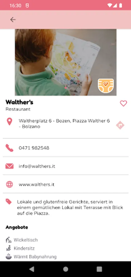 It shows you the nearest baby-changing station, children playground or the next family-friendly bar and restaurant. Anyone travelling in South Tyrol with babies and children can use the BabySpot App to find out places or contacts that are important to have with you. There is the possibility to add new places, which after a short check, can be added to the BabySpot App.