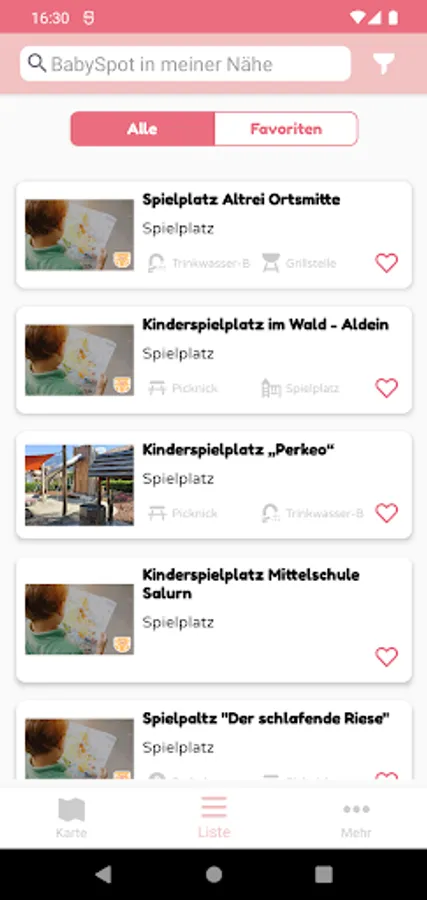 The BabySpot App shows places in different categories. In some categories there are subcategories: For example, you can filter children's playgrounds, only baby-friendly cafés with a changing table or an emergency changing kit, etc.