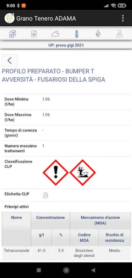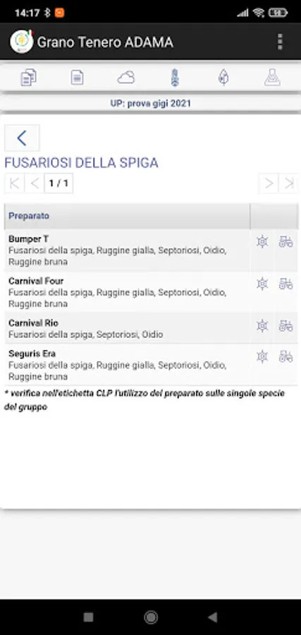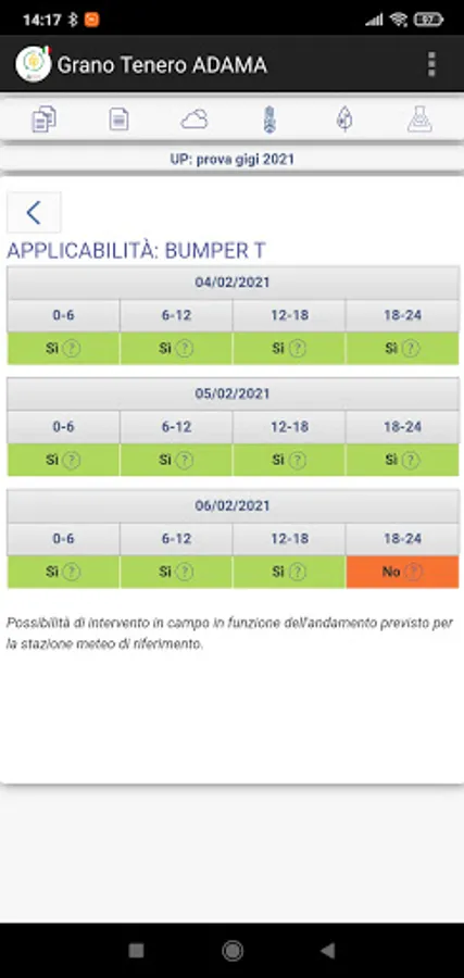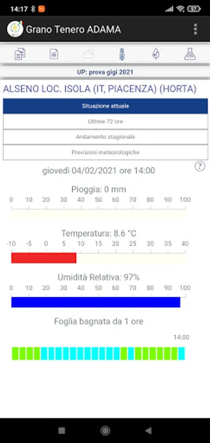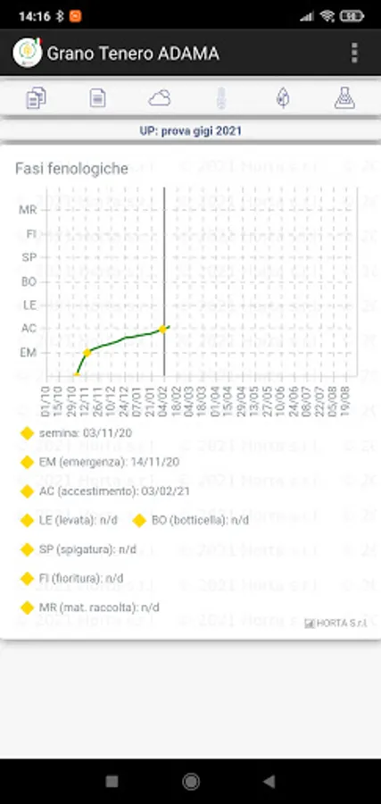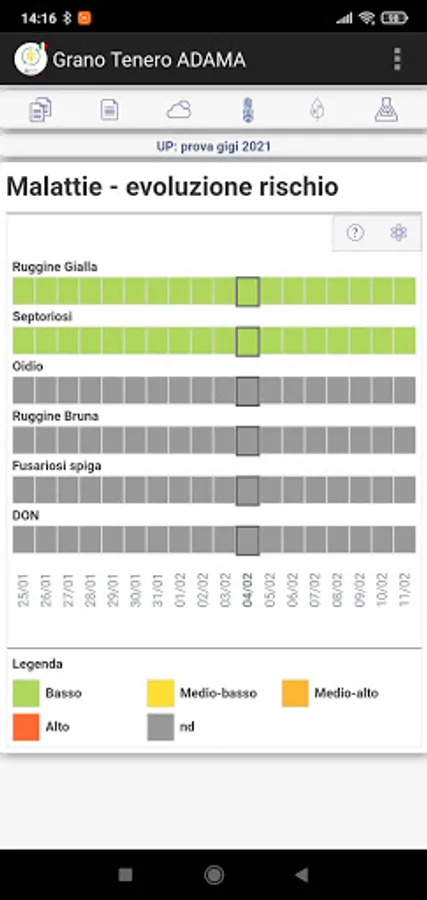 Developed in collaboration with Horta S.r.l., Grano Tenero ADAMA is configured as a DSS (Decision Support System) specific for soft wheat. The system combines an IT platform that collects crop and environmental data, then organizes, interprets and integrates them automatically, indicating the best time to carry out the phytosanitary treatment. After entering some simple data (such as position of the plot, type of processing, variety and date of sowing), the system clearly and immediately returns information relating to the infectious pressure of brown rust and yellow rust, septoria, powdery mildew, fusarium of the ear as well as the risk of onset of mycotoxin deoxynivalenol (DON).