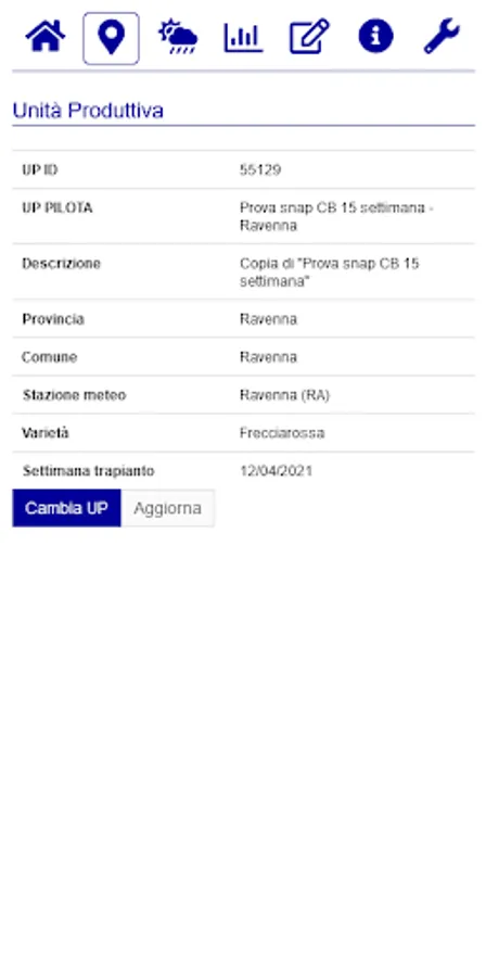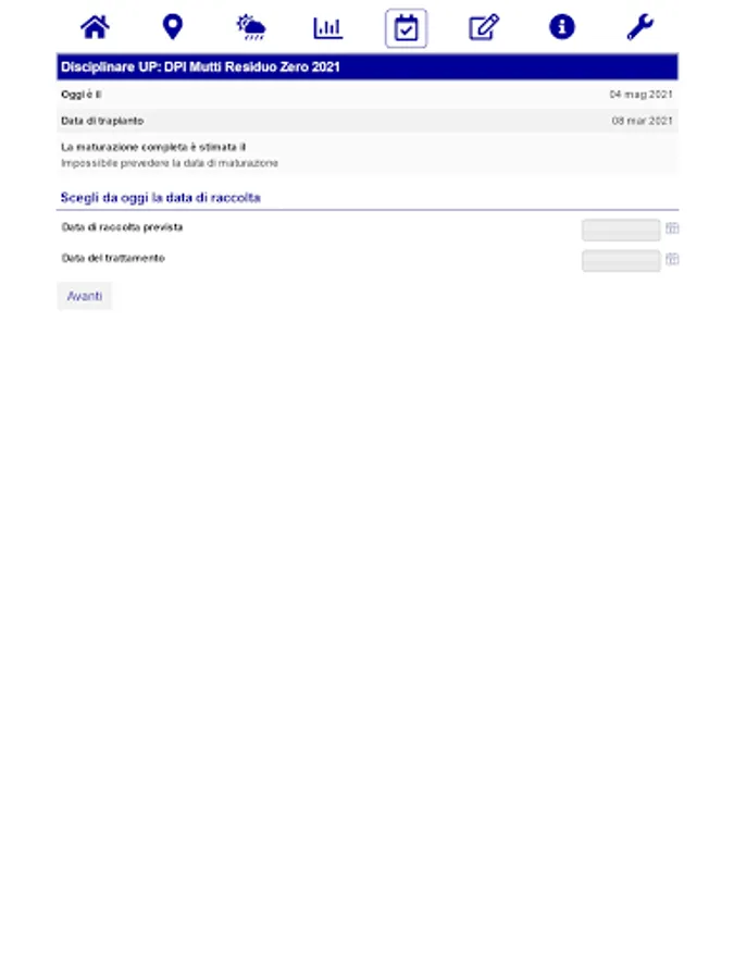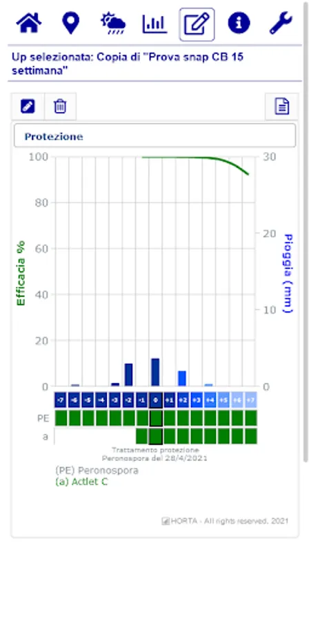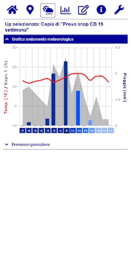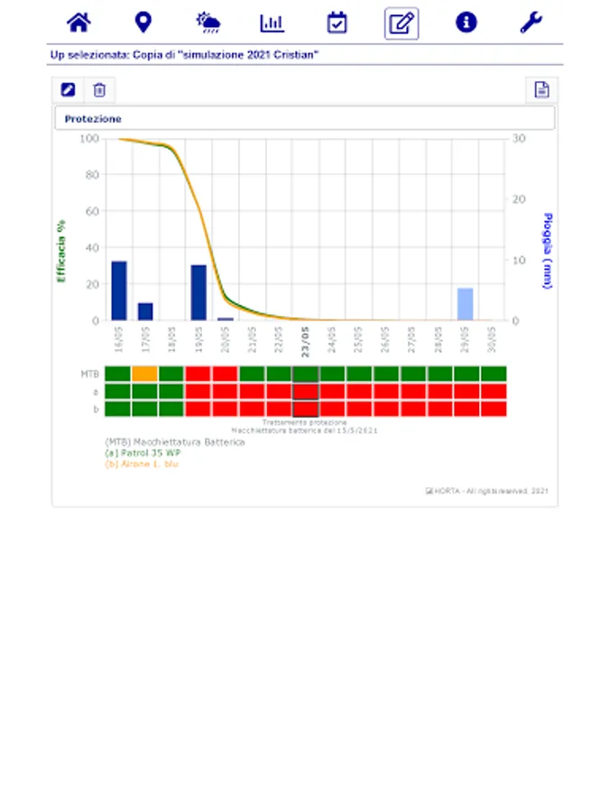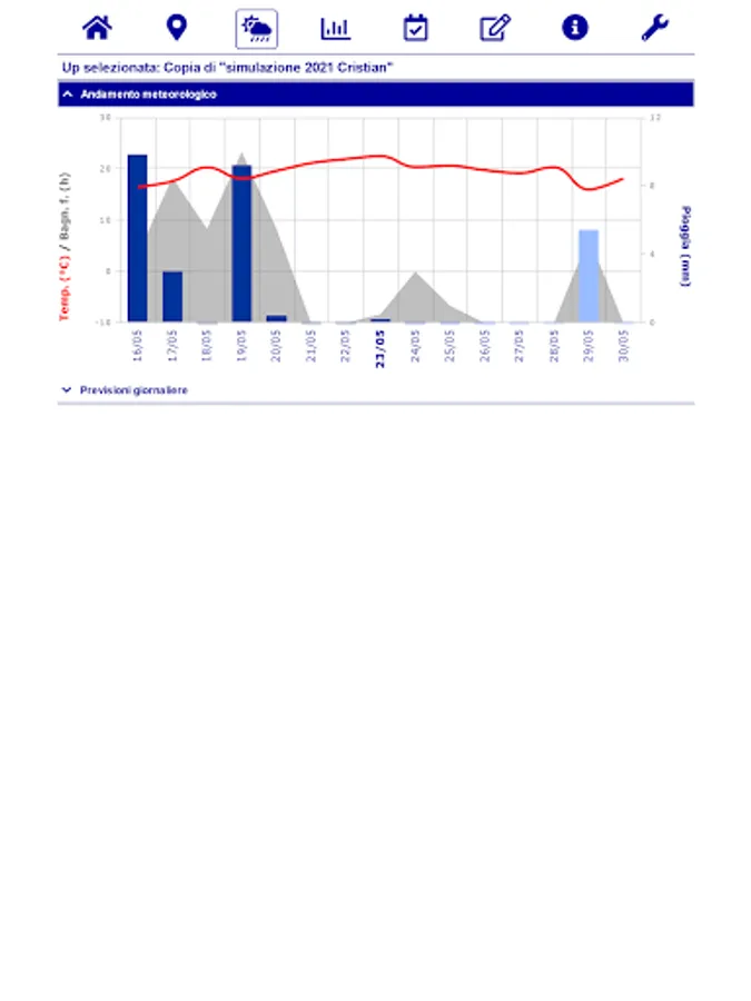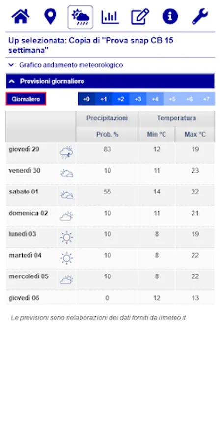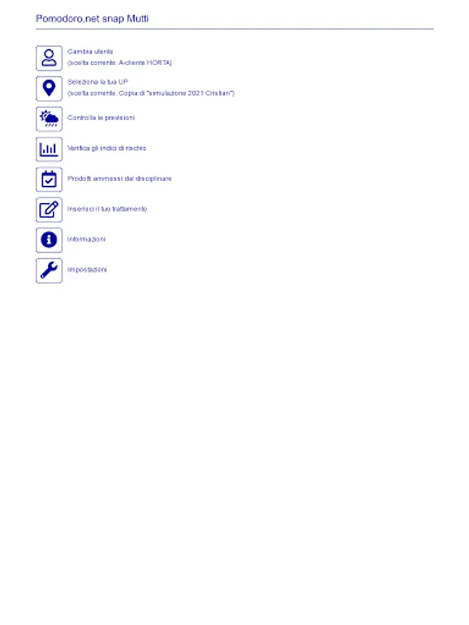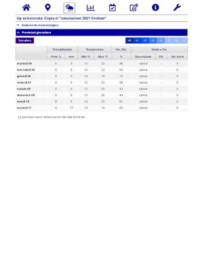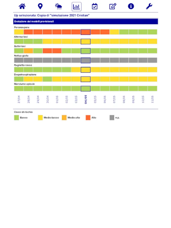 From your smartphone, using your username and password, you can consult information in real time on: the weather situation of the last seven days and seven-day forecasts; synthetic risk indices relating to the main adversities (downy mildew, alternariosis, bacteriosis, yellow nocturnal, red spider); trend of the crop evapotranspiration, the conditions predisposing the apical rot and the protection dynamics of a registered phytosanitary treatment.