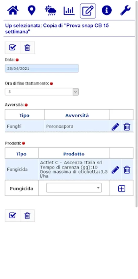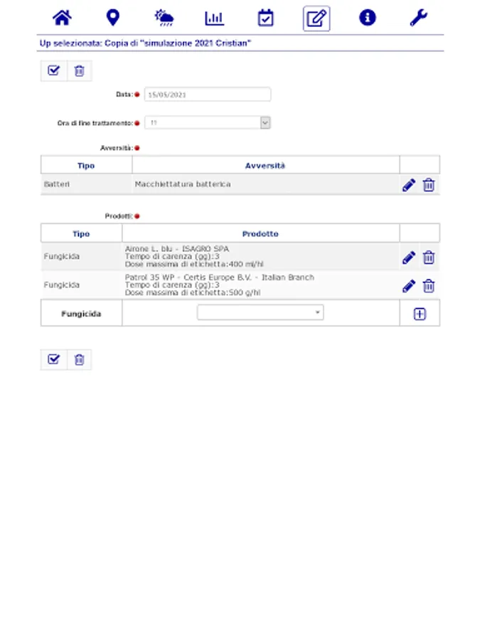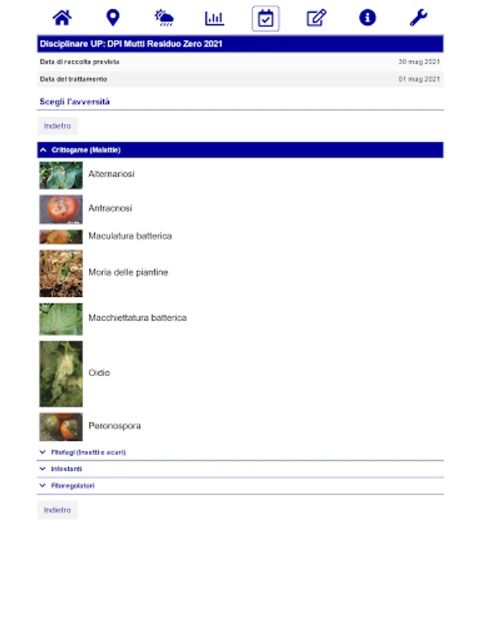 The database present in pomodoro.snap Mutti is integrated with the “Zero Residui” Integrated Production Regulations by Mutti; this allows the user to view only the products allowed in the time interval between processing and collection.