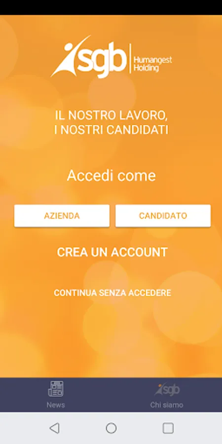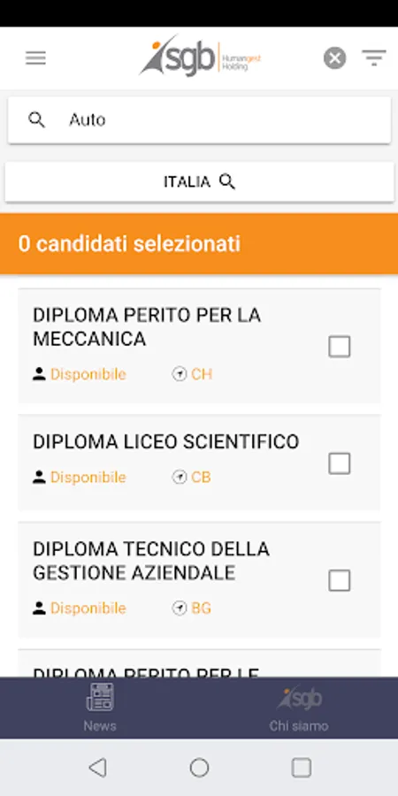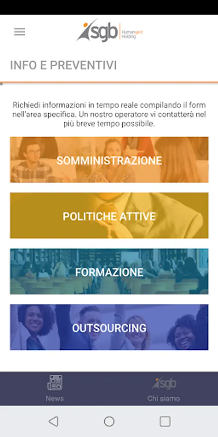 The SANG Humangest App allows our Candidates to view the news from the SGB world divided by category (Job, Training, Outsourcing, Payroll), consult the job vacancies posted on the Humangest website, apply with one touch and update the own curriculum. In addition, our Workers can access their reserved area to view the list of contracts and salary slips (these documents can not be consulted and downloaded.This function will be available with the next updates).