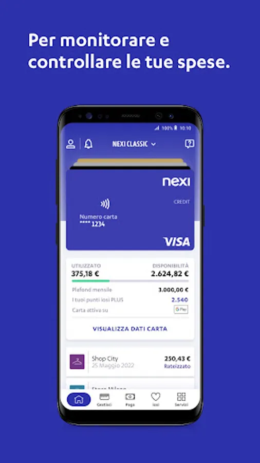 Nexi Pay is reserved for customers in possession of a card issued by Nexi or a Partner Bank. The services available may vary depending on the type of card. The application requires Android 5.0 or later.