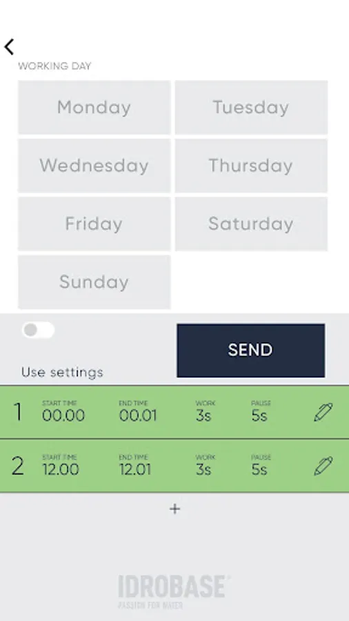 - Advanced mode: will set the working days on which the pump is active and up to 10 advanced configuration of start/end time, spray/pause time.