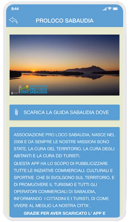 Official application of the Pro Loco Sabaudia association. The Pro Loco of Sabaudia is an association that carries out the following activities: hospitality and tourist information, excursions in the area, organization of events, railway ticketing, Co.Tra.L. and urban bus services, Metrebus passes, ferry reservations from San Felice Circeo to Ponza, TNT Point. Actively participates in social initiatives.