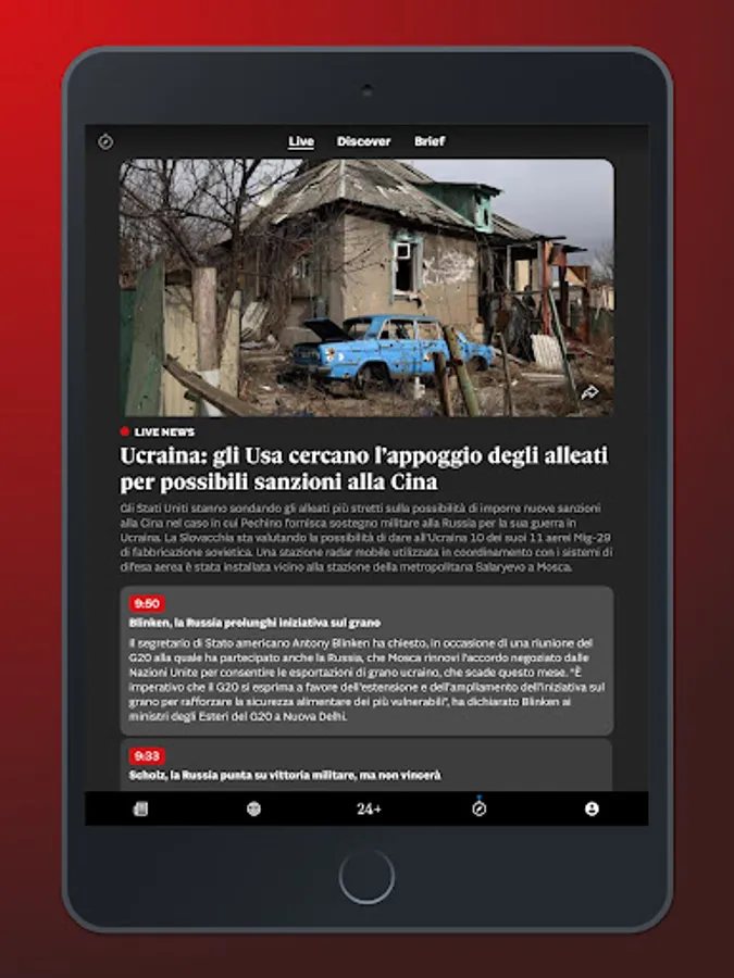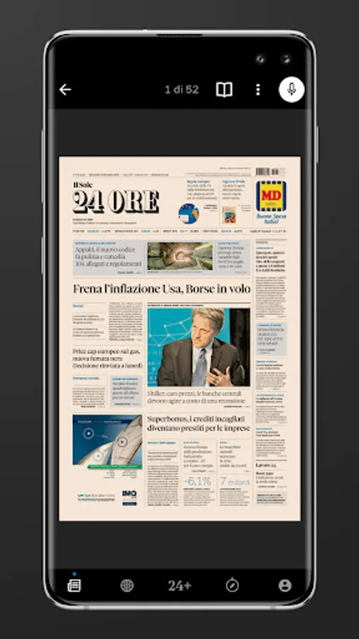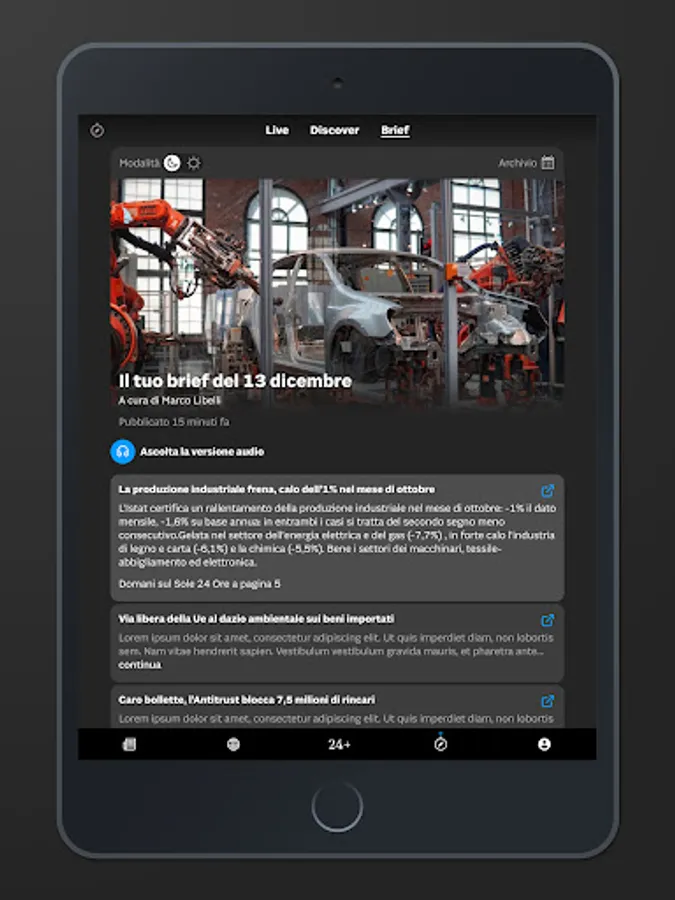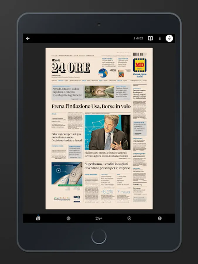 The digital copy of Il Sole 24 Ore and the inserts on newsstands, starting at 00:30. In addition, quick access to podcasts, news from the site and premium products, the archive of newspaper inserts and the main books in the catalogue.
