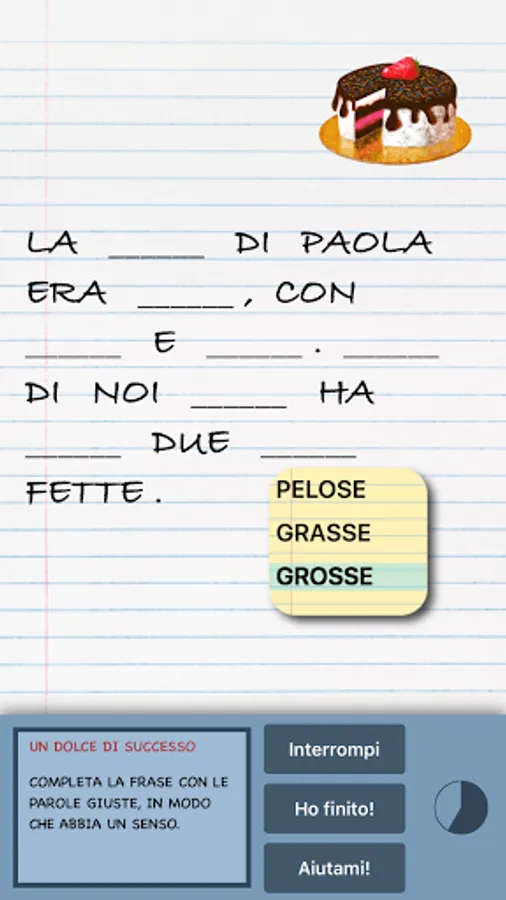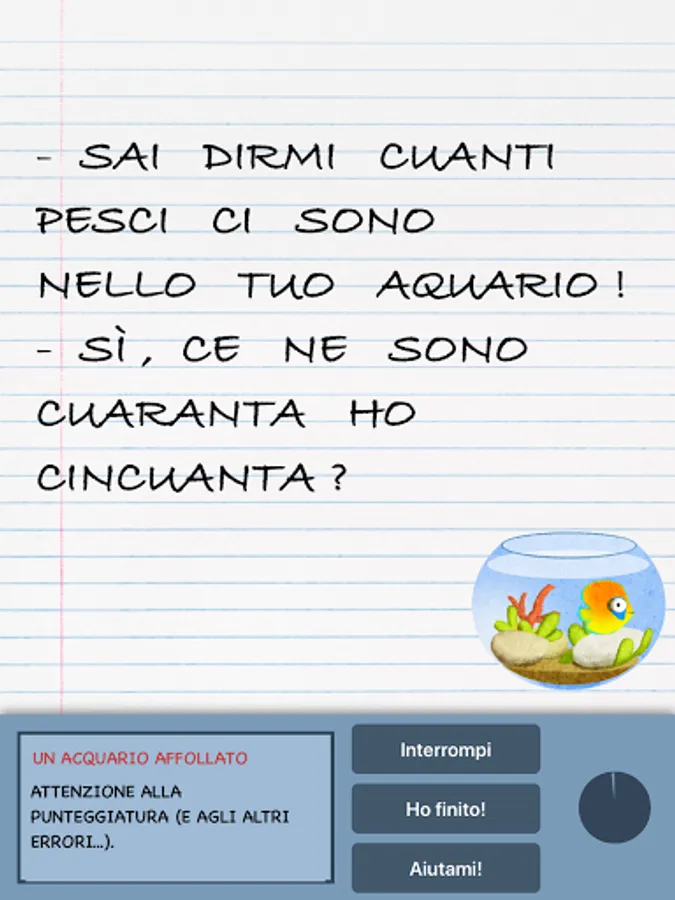 The execution of an exercise is simple and instinctive: each sentence presented contains several errors that can be corrected by touching the various 'parts of the speech' and selecting the correct word or punctuation mark in a title block; some sentences must be completed, inserting the missing elements. When you choose an option, the sentence is rewritten with the new element. The end of the exercise is signaled by touching a button, or occurs automatically at the end of a predefined time for each sentence.