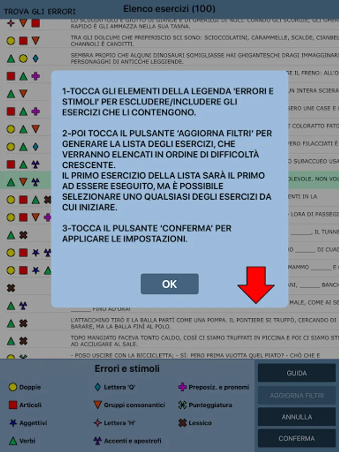 The complete list of exercises (100, in total) is shown in a separate screen and presents the text with the errors and a series of symbols that indicate the main types of errors contained in the exercise. If you touch the symbols on the legend you can exclude / include the exercises that contain them. A button allows you to create lists of exercises chosen according to the set exclusions.