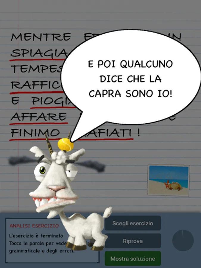 “Grammatical Horrors” presents a series of sentences and short dialogues containing errors to be identified and corrected, choosing from several options. The app is embellished with original images created by Federico Mancini, a well-known illustrator of fairy tales and children's books.