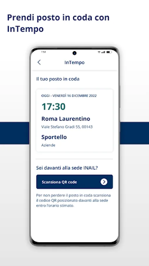 It allows you to take a seat in the queue remotely at the counter of the relevant Inail office by choosing it from the map or by directly scanning the QR code that you will find at the office.