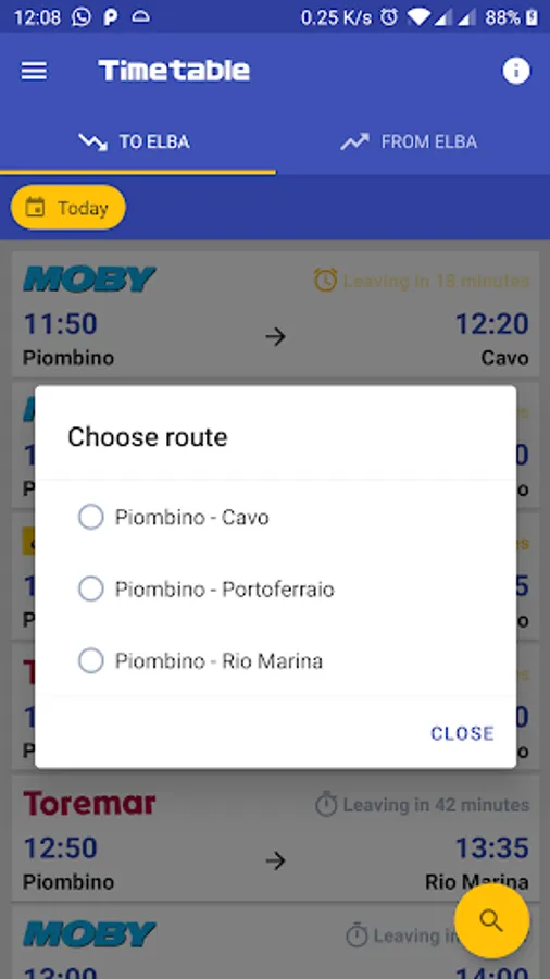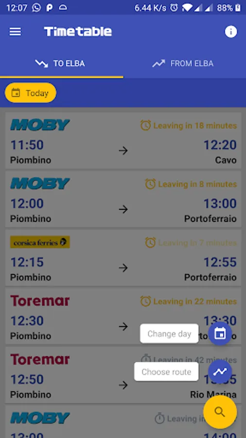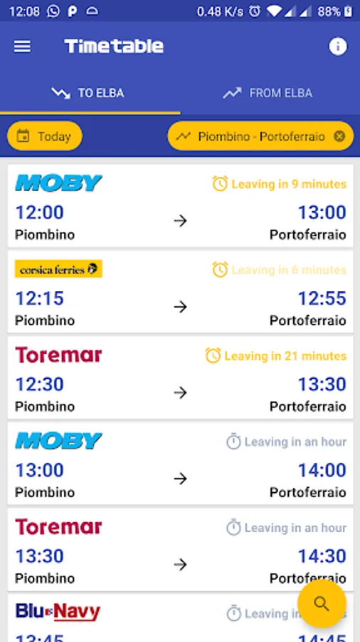 The Elba Ferries App enables you to find out the frequency and times of all the crossings to and from Piombino and the Island of Elba, and it is completely free. Once you have downloaded this App, you can quickly and easily view the complete, up to date timetables of each of the four Shipping Companies that cross to and from Piombino (Toremar, Moby Lines, Blu Navy and Corsica Sardegna Ferries) and all the ports in the Island of Elba: Portoferraio, Rio Marina and Cavo. Should you need to, you can also change the times and dates of your booking in no time so you can choose the time and date that suits you best.