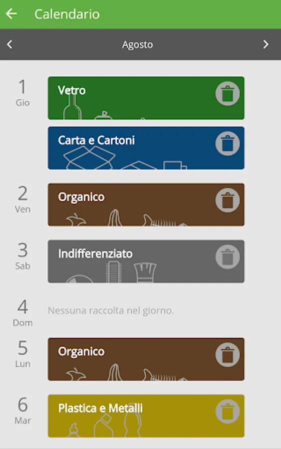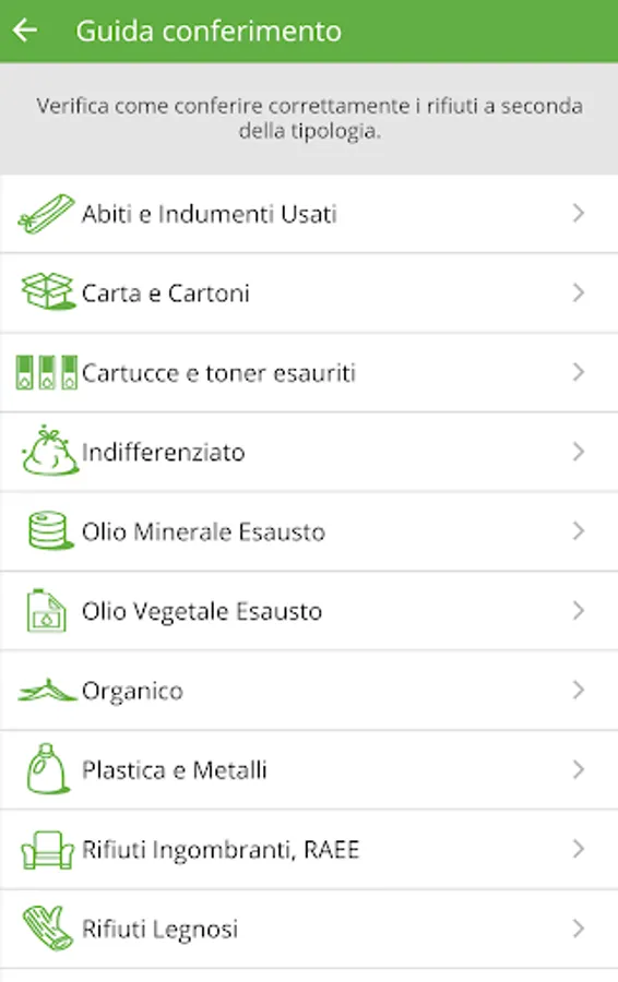 The app offers the user a series of functionalities through which it is possible to know and investigate how to dispose of waste, but it is also a useful tool to send alerts and requests for home collection, to know the opening hours and days of the Center for Collection, personalization of notifications and many other functions.
