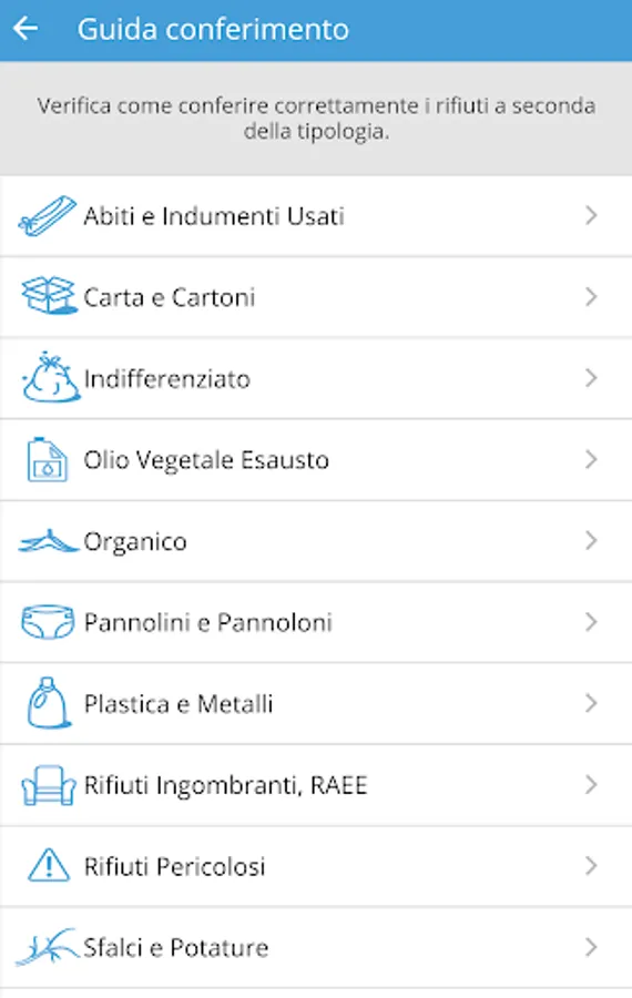 The app offers the user a series of functionalities through which it is possible to know and investigate how to dispose of waste, but it is also a useful tool to send alerts and requests for home collection, to know the opening hours and days of the Center for Collection, personalization of notifications and many other functions.
