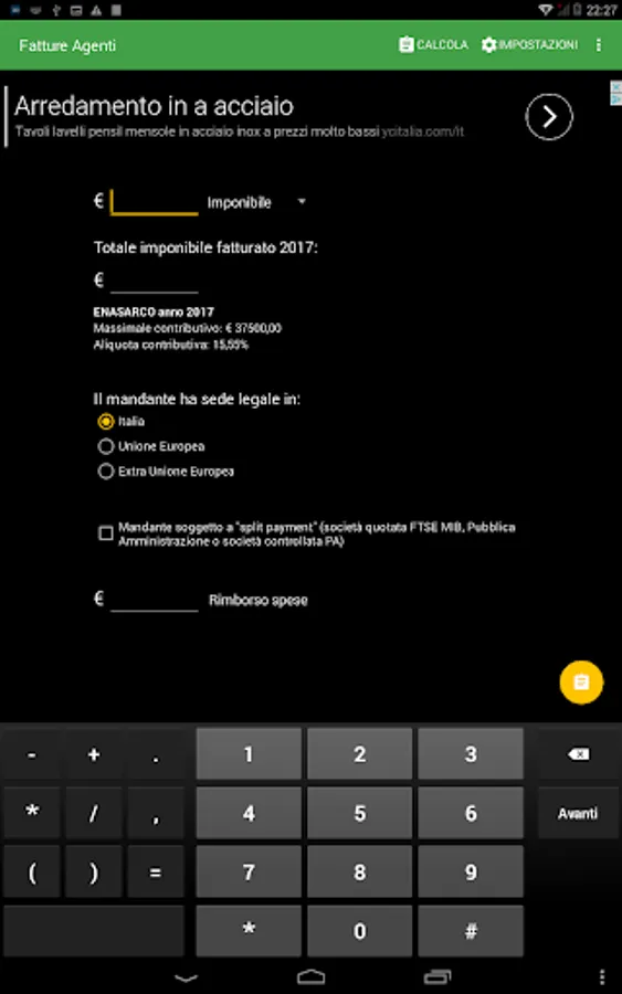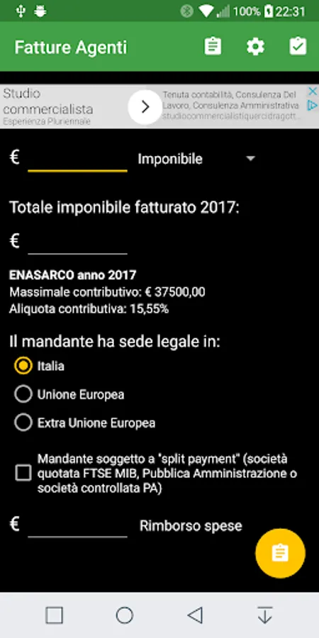 - Calculation of social security contributions (agents in the form of sole proprietorships and partnerships - SNC, SAS) and welfare contributions (joint companies - SRL, SPA - annual commissions up to 13 million euros)