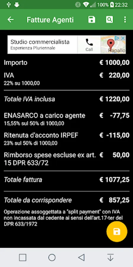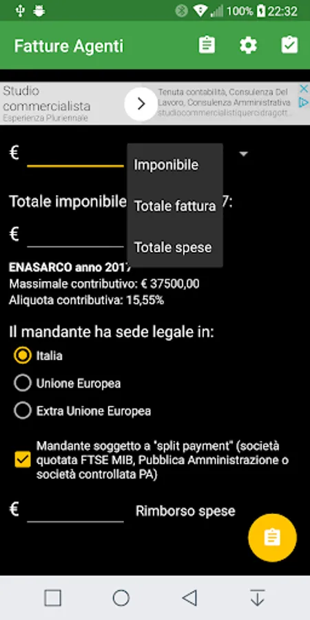 > reverse invoice (extraction of VAT, contributions and IRPEF withholding tax) starting from the total expenses (total expenses incurred by the principal)