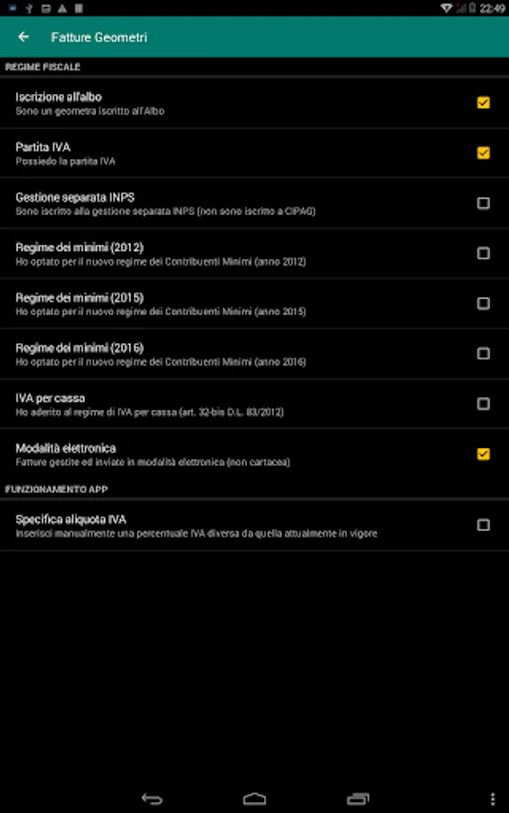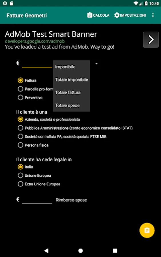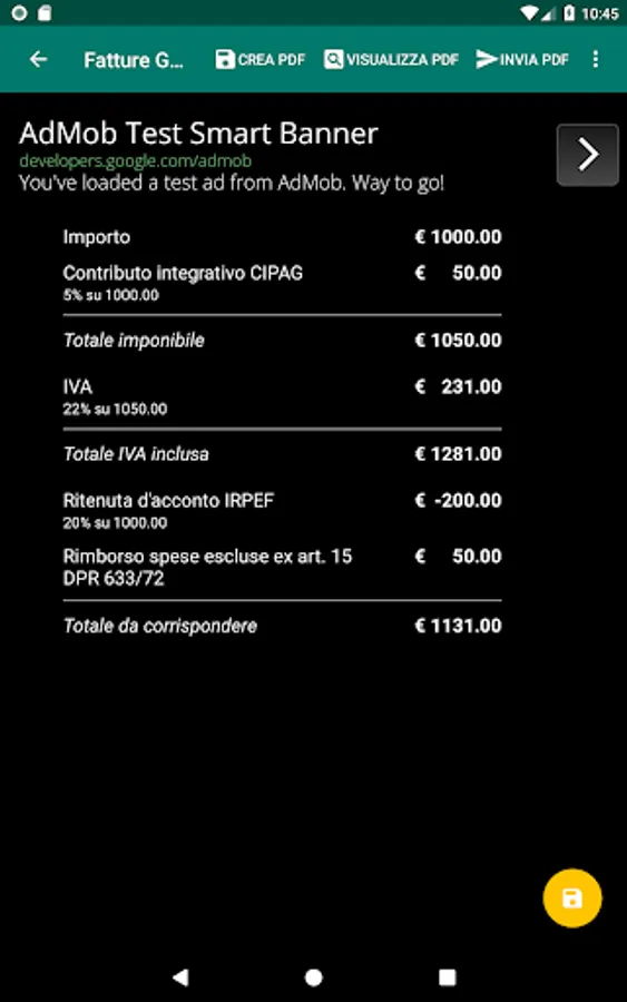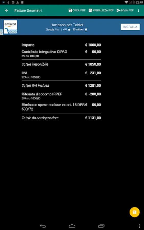The paid PRO version is also available without advertising and with various additional features, such as, for example, the ability to save PDFs and send them via email. See the detail page for more information (https://play.google.com/store/apps/details?id=it.innovationquality.fatturegeometripro).