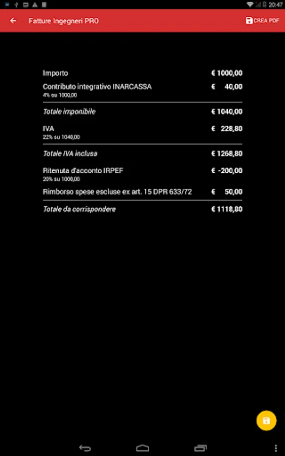 - Saving in PDF of the calculation made only or of a real complete invoice. Files are stored on external memory (SD card)