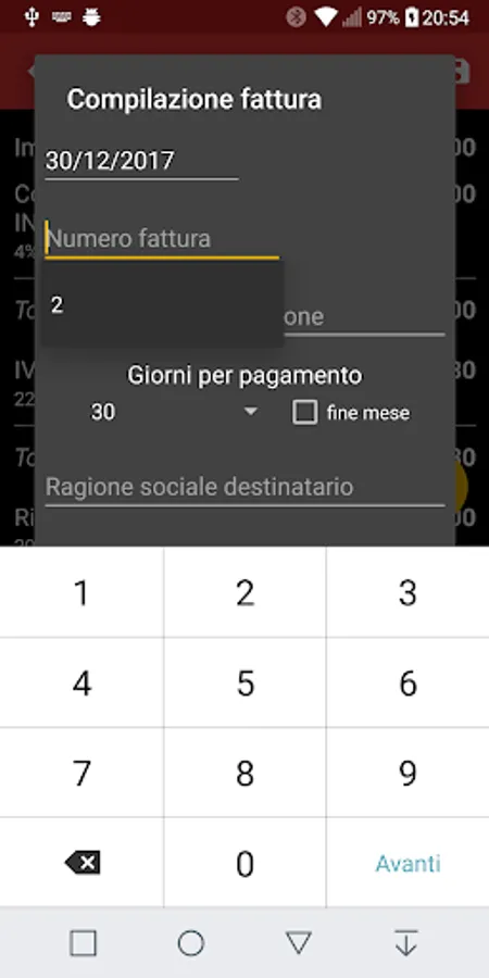 - Invoice compilation: recipient data, invoice number and date, days for payment