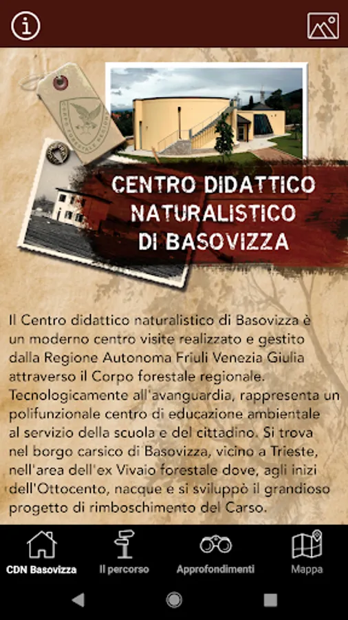 Application that takes you to explore the nature trail dedicated to Josef Ressel: an equipped path for the blind who stretches for 5 km on the easy flat paths of the Boschi Igouza and Lipizza and passing the state border, connects the village of Basovizza to the Equipe di Lipizza, home of the historic horse farm. Alongside the route, 14 parking areas have been created with trilingual information tables including some equipped with tactile materials for the blind. Along the way, activities are also proposed to better understand the forest ecosystem as a whole and to give concrete answers to current environmental problems.