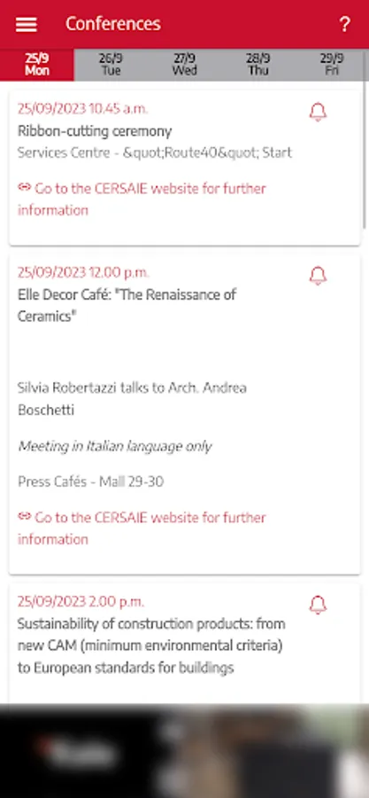 In the app you can also find all the information on the conferences, exhibits and events organized by Cersaie with possibility to set a customized reminder for the conferences you are registered for and to add vocal, text and photo notes in each exhibitors page