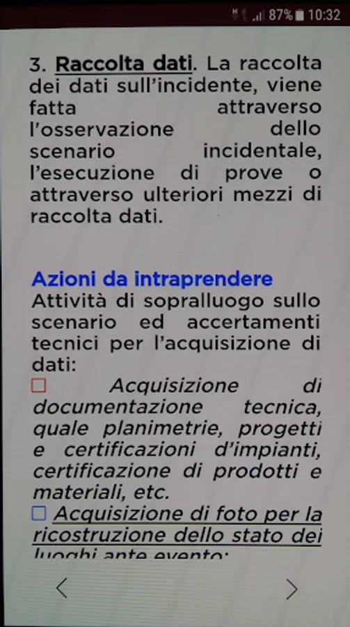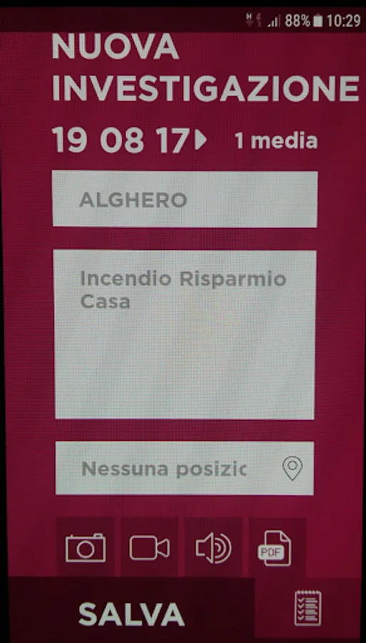 The application totally free, contains a guideline on the list of investigative activities to be performed in case of fire, as well as the indication sequential order with which those activities must be performed. The App during first startup, provides the ability to create specific workbooks, each identified by a short name, a notes field to describe the investigation and the location of the fire scenario. The latter can be acquired through the smartphone's GPS function.