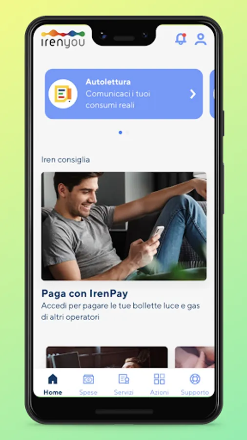 Using IrenYou you can comfortably manage both your contracts and the contracts of other holders, you can view the bill at the same time it is issued directly on the screen of your mobile phone and pay it with a click in an easy and safe way through the IrenPay payment service (currently only available for payment of electricity and gas bills), using your bank's online payment account.